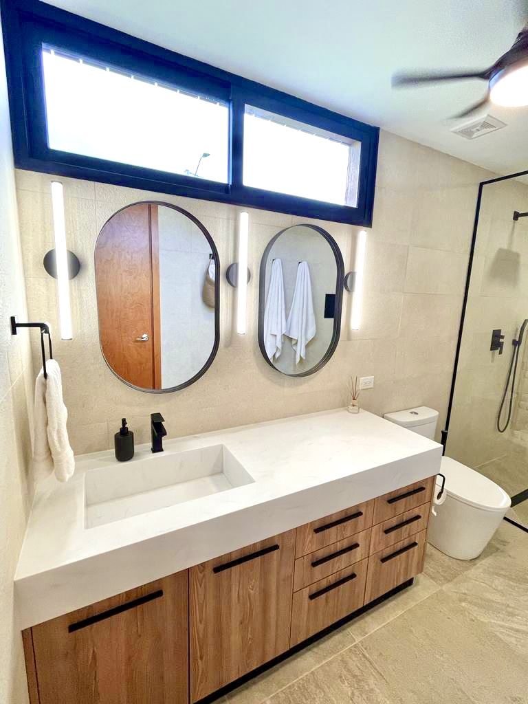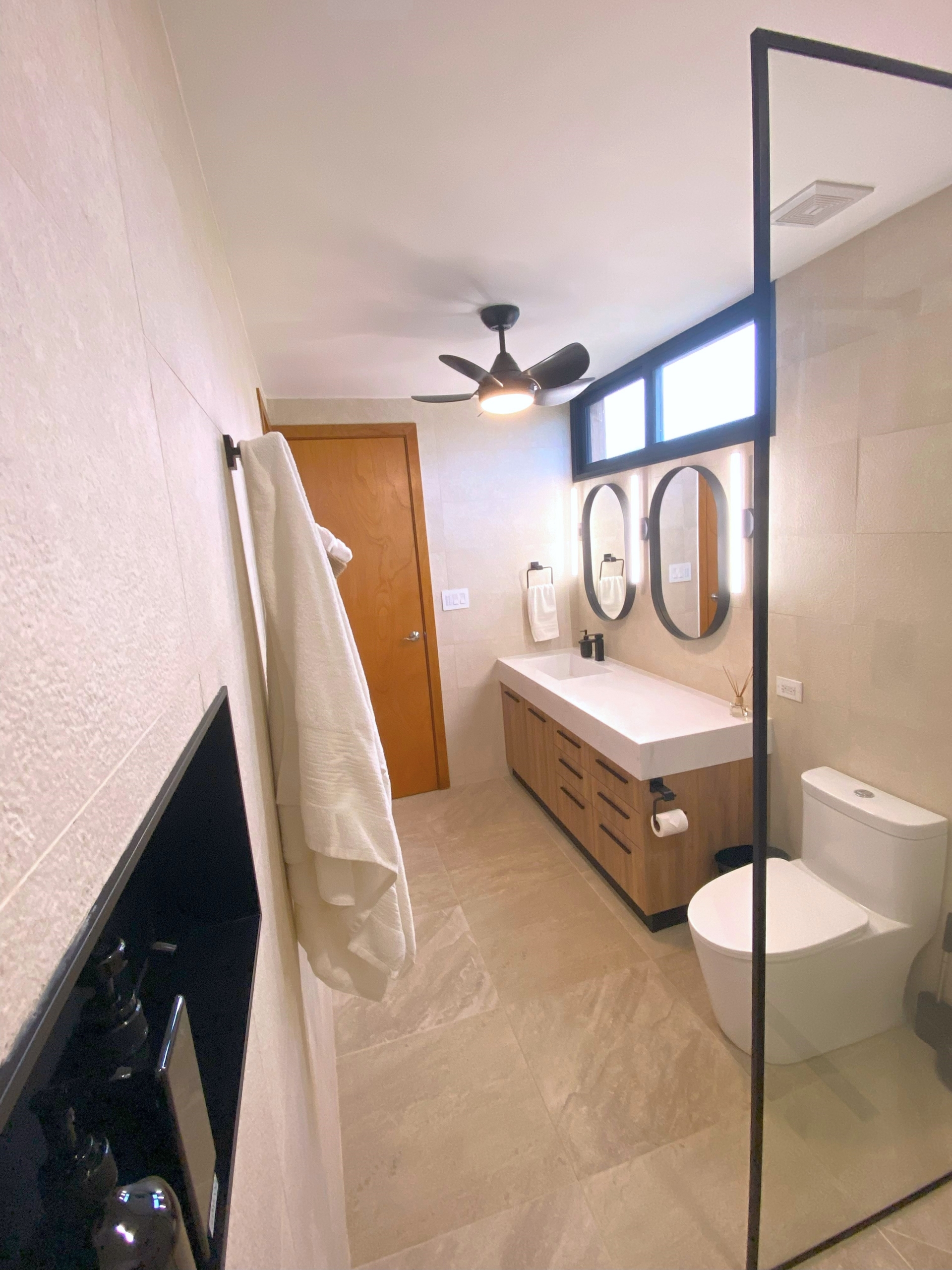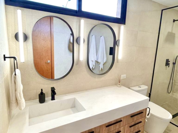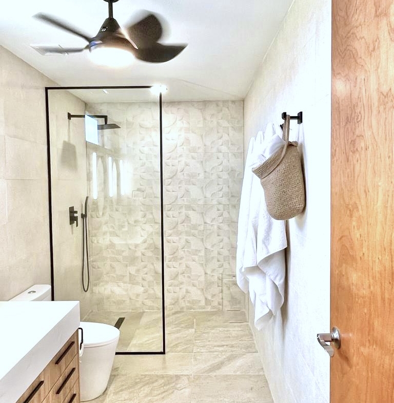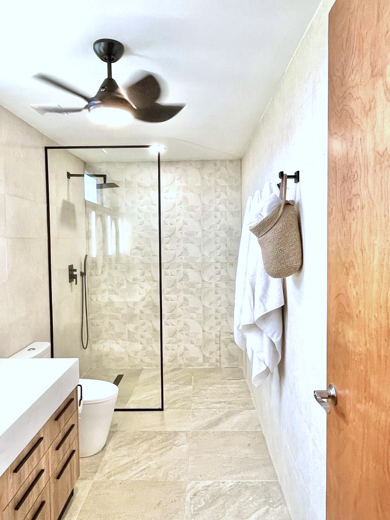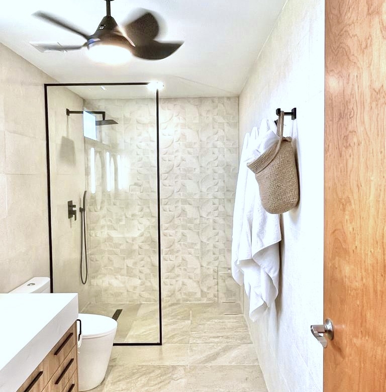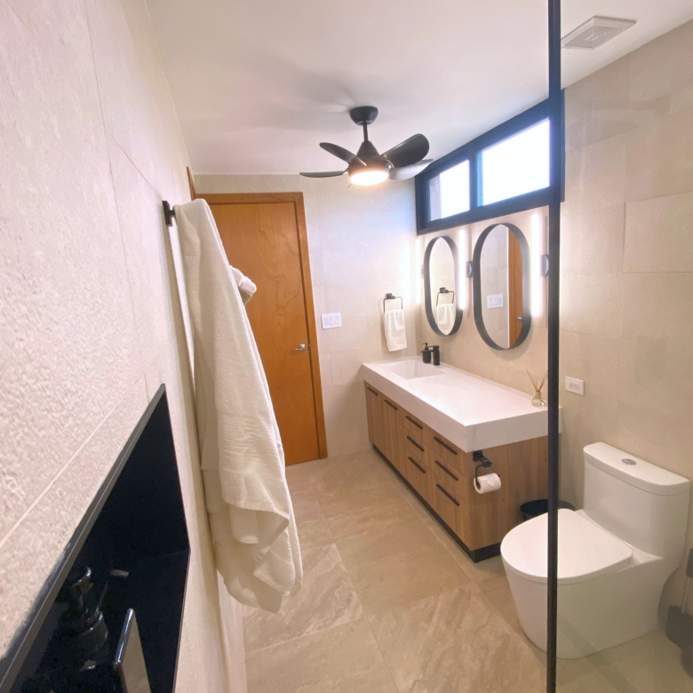 * Luxurious Bathroom: The bathroom features a seamless walk-in shower with a shower niche, an exhaust fan, a ceiling fan, non-slip tile floors, and floor-to-ceiling tiling throughout. A large vanity with double mirrors adds a touch of elegance.
