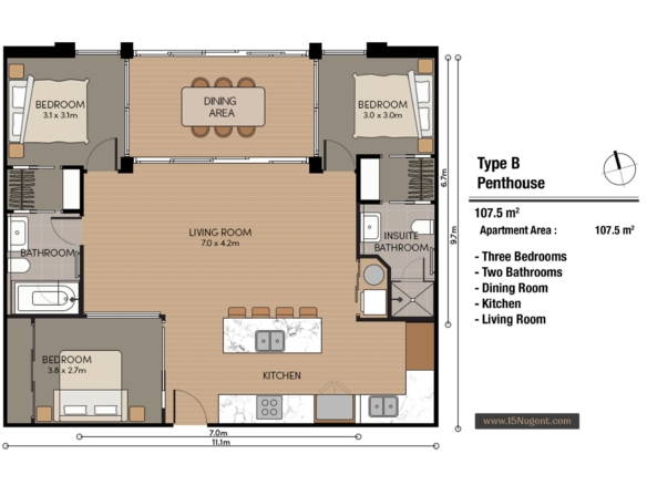 514 3 Bedroom 2 Bathroom + Balcony & 1 Tandem Carpark AU102&103 130.5m2 € 1,373,500