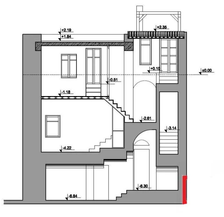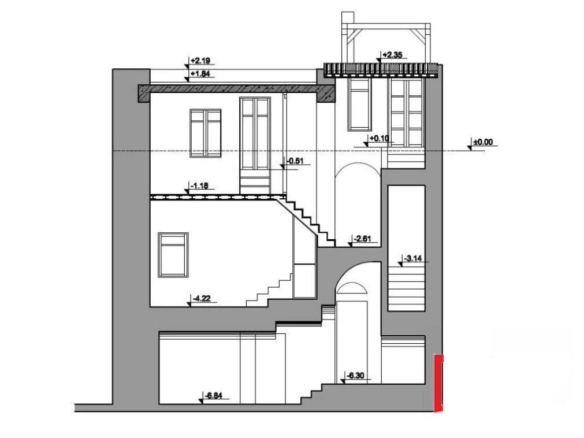 Divided into three levels, the total amount of living space of the property is 166 sqm. The ground floor measures 67 sqm and features the living and dining area, the kitchen, a guest WC, and a storage room. The first floor, slightly more spacious than the ground floor, is 82 sqm and has a second living room with a fireplace and access to a veranda, a study room, a bathroom, and a bedroom. The top floor is a 17 sqm second bedroom.