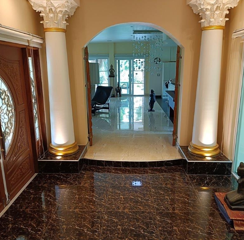 Did we forget to mention the large terrace to chill out and the teakwood pavilion with Koi fish pond? The pool-house comes with a roofed pool and large barbecue area to gather with your loved ones.
