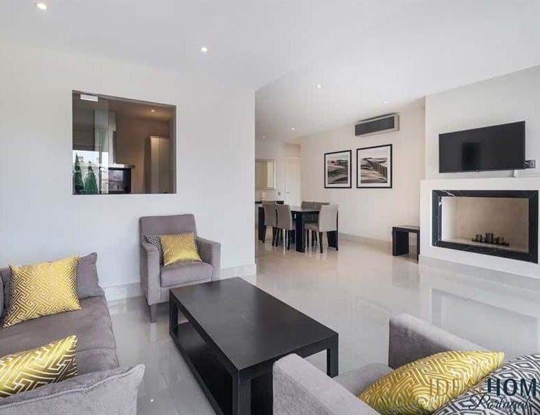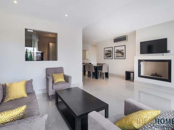 This spacious, light-filled apartment features two generously sized ensuite bedrooms, a guest WC, a separate laundry and storage area, and a modern, fully equipped kitchen with high-end appliances, discreetly separated by elegant glass sliding doors that enhance the natural light. The open-plan living and dining area includes a cosy fireplace and leads directly onto a private, south-facing terrace with direct access to the swimming pool and lush resort gardens. Enjoy sunbathing on the loungers or dining alfresco with views over the meticulously landscaped grounds.