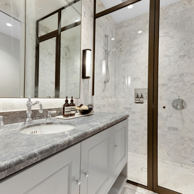 • Pulling out all the stops with expansive living areas, marble-clad staircase, stone fireplace, chevron style flooring, bronze windows and hardware, European kitchen with butler’s pantry and separate powder room.