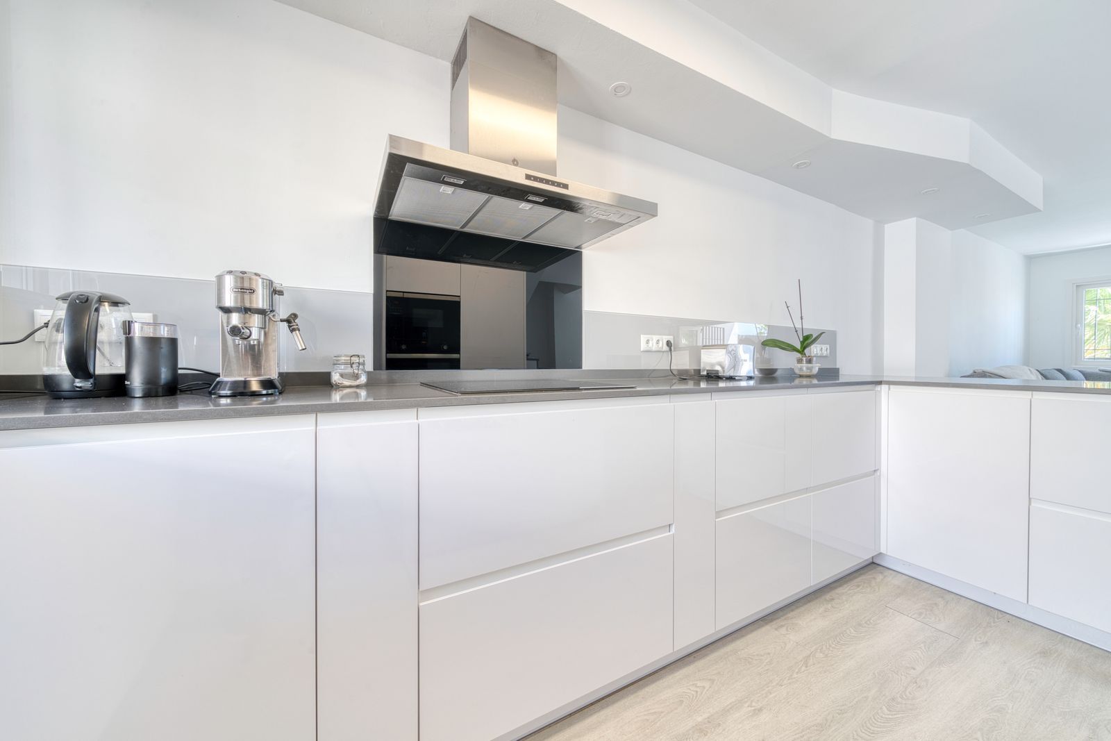 * A seamlessly integrated modern design kitchen, dining, and living area, creating an open-plan space that is both stylish and highly functional. The kitchen is fully fitted with contemporary appliances, promising a delightful culinary experience.