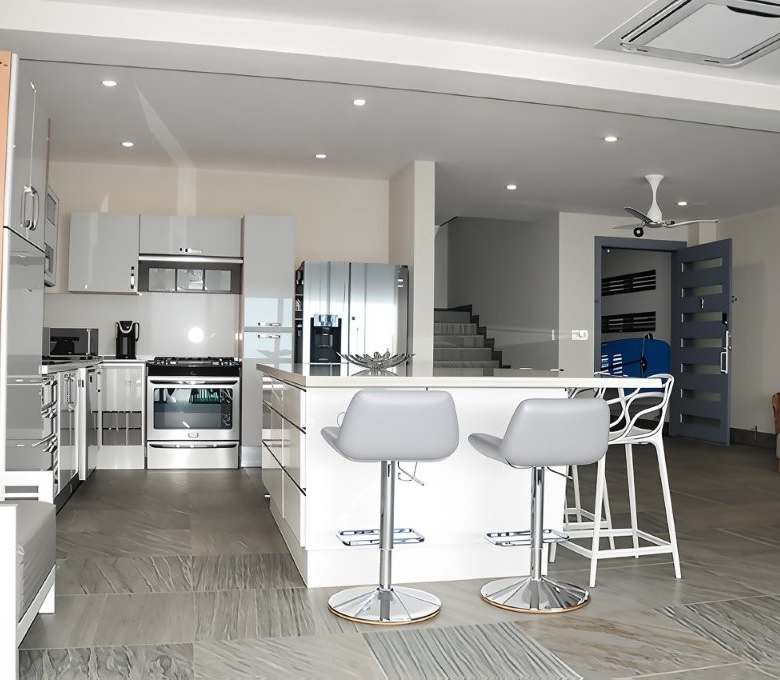 The gourmet kitchen at Casa Siesta is a culinary enthusiast’s dream, a harmonious blend of functionality and aesthetic elegance. Featuring custom Italian cabinetry, renowned for its superior quality and sophisticated design, and a large, central island that serves as a natural gathering point, this kitchen is ideally equipped for both intimate family meals and grand entertaining. The high-end appliances and thoughtful layout ensure a seamless cooking experience, while the ocean views provide an inspiring backdrop for culinary creativity.
