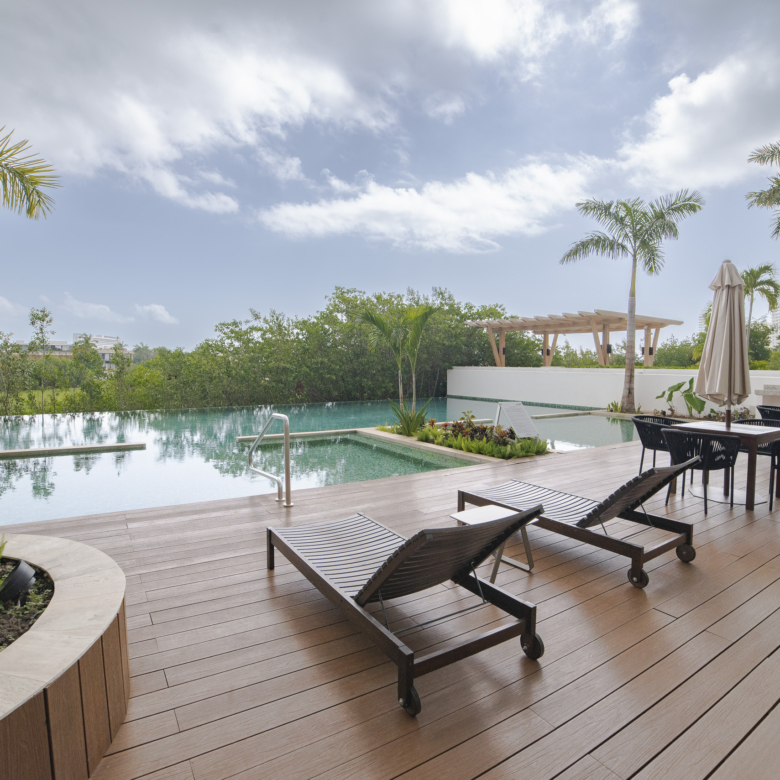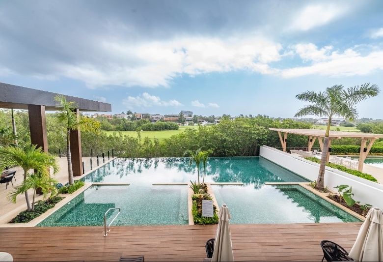 * Community Amenities: The Puerto Cancun complex offers a wide range of amenities for residents to enjoy, including family and adult pools with grill and sunbathing areas, a pool for little kids with a playground, a spa with a Jacuzzi and massage beds, seniors and juniors lounges, a multipurpose area for events, a business center, and a gym.