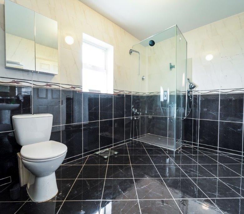 Ceramic floor tiles, shower, WC, hand wash basin, tiled wet areas, PVC window, light fitting