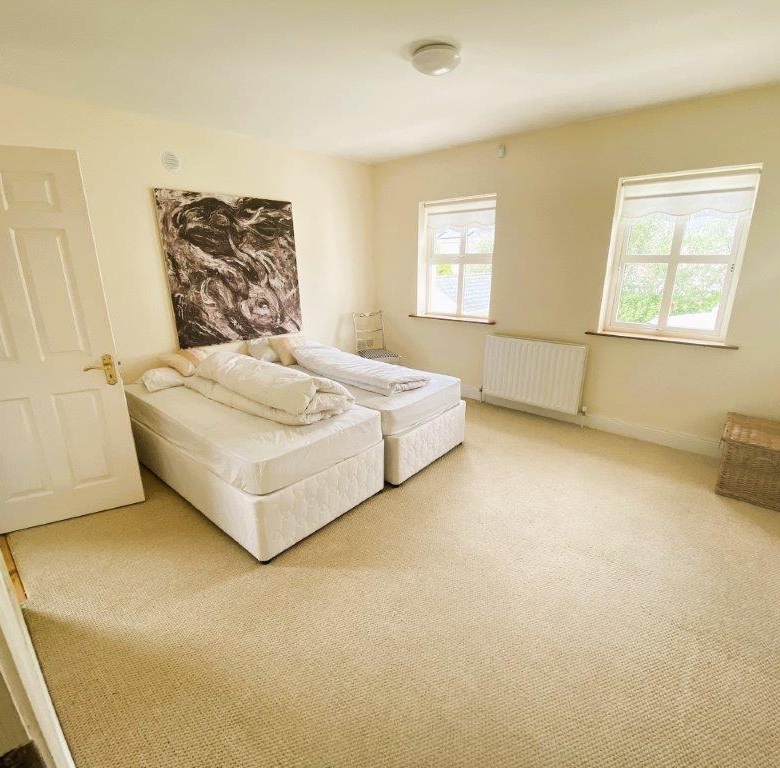 Dual aspect room, carpet flooring, dressing area with fitted wardrobes, large bathroom with double shower unit, WC, hand wash basin, vertical radiator, light fitting