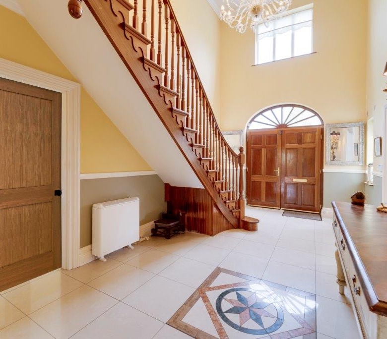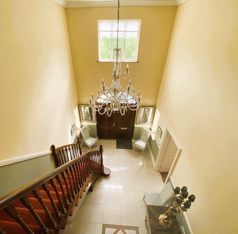 Dual front doors lead into a double height entrance hall with galleried landing, chandelier, and bespoke staircase.