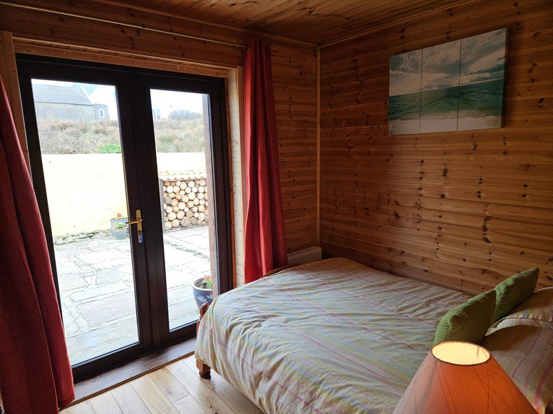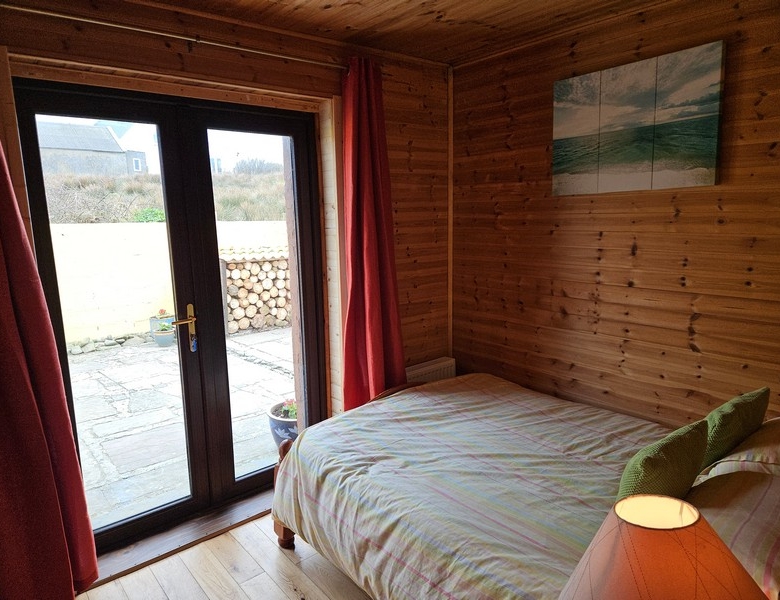 Double bedroom located to the left of the reception hallway with double French door to paved patio area. Wooden flooring with feature wooden walls and ceiling. Integrated wardrobe.
