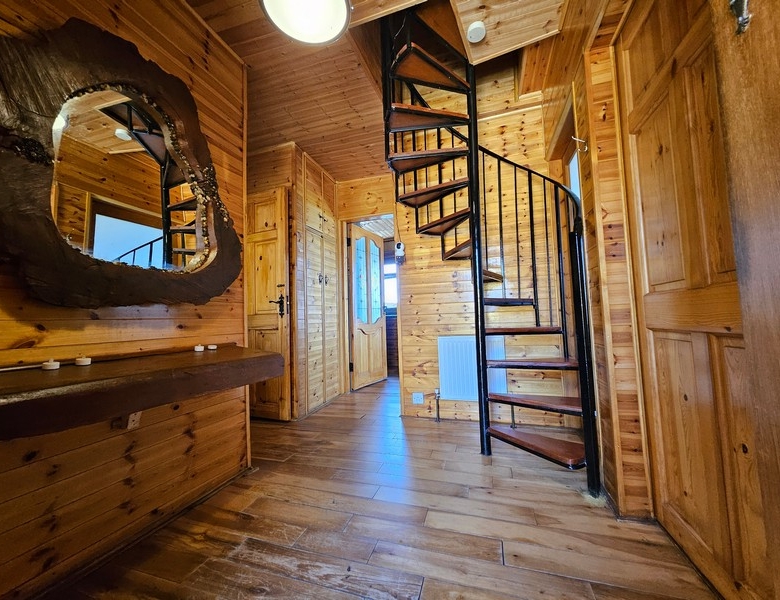 Warm & welcoming with wooden flooring and wood panelled walls Ornate ceiling light. Spiral staircase to first floor attic room