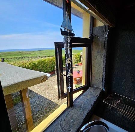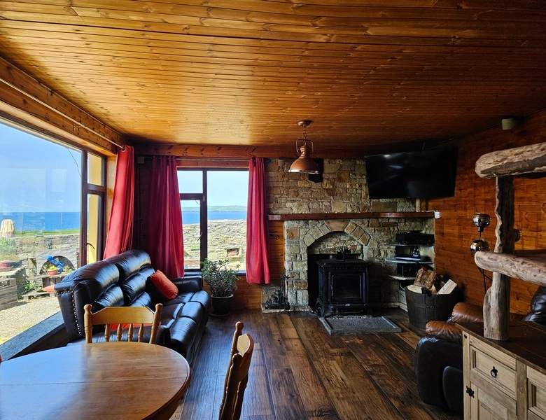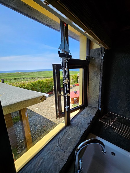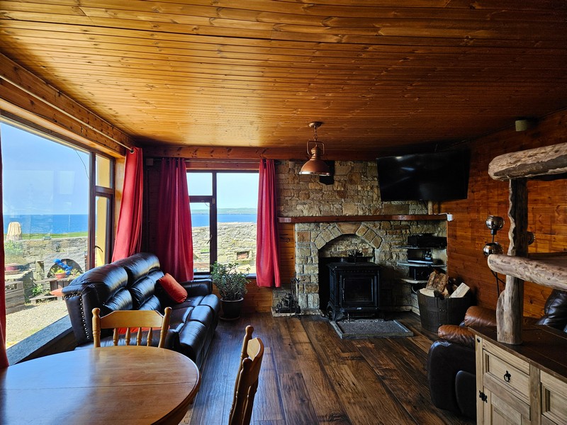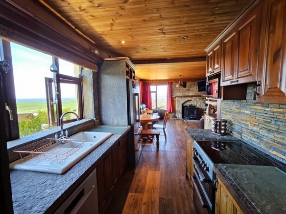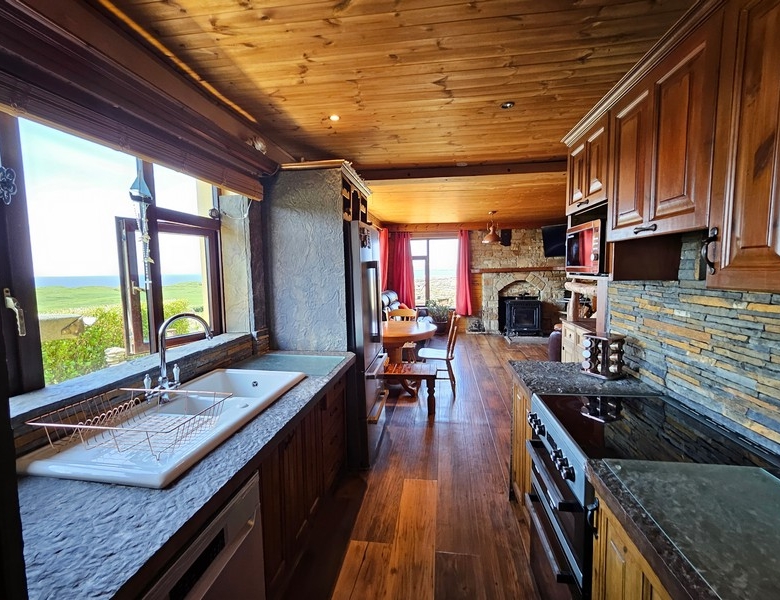 Large open plan room with 3 large windows affording uninterrupted views of the sea and bay. Unique decorative hub of the home with an abundance of character and bespoke features such as `Liscanor` stone worktops, splashback & window sills, hand crafted wooden shelving units, good quality tiled floor, beautiful sandstone fireplace and mantle with stone hearth. Large solid fuel stove with back boiler in the living room area. Wooden beam division between cooking/dining & seating areas. The kitchen is fully equipped with all modern integrated appliances including ceramic double well sink.
