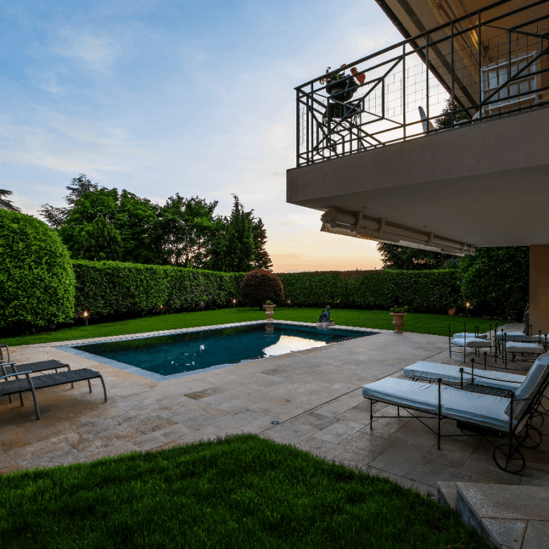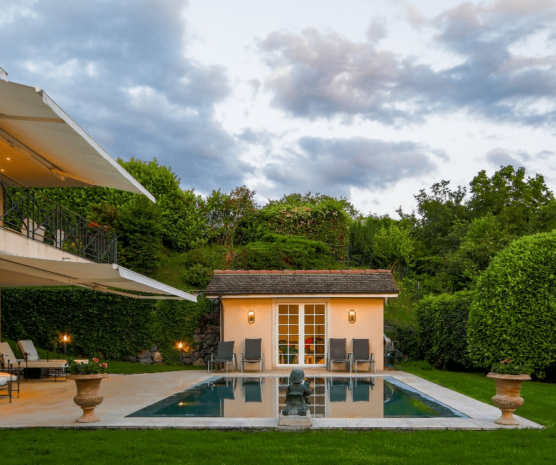 The outdoor spaces of this exceptional villa are a true highlight, featuring three very private and sheltered gardens, each designed to offer a unique ambiance and connection to nature. Terraces seamlessly connect to the three main bedrooms, extending the living space outdoors and providing private vantage points to enjoy the stunning scenery. A further terrace is conveniently accessible from the kitchen, perfect for al fresco dining and enjoying the morning sun. A raised pergola offers an elevated perspective overlooking the vineyards, the majestic mountains, and the glistening lake, creating an idyllic spot for relaxation and contemplation. The natural stone infinity pool is a masterpiece of design, complete with a large terrace for sunbathing and entertaining, and the provision for a pool house to be customized to the owner’s preferences. A charming garden shed provides practical storage for outdoor equipment. The secluded swimming pool and gardens offer a private sanctuary, further enhanced by the villa’s integrated security system and alarm system. Despite its secluded setting, the property is ideally located just 3 minutes from the vibrant town center, reputable schools and colleges, convenient train stations, diverse commercial centers, and easily accessible bus stops, offering the perfect balance of tranquility and convenience.