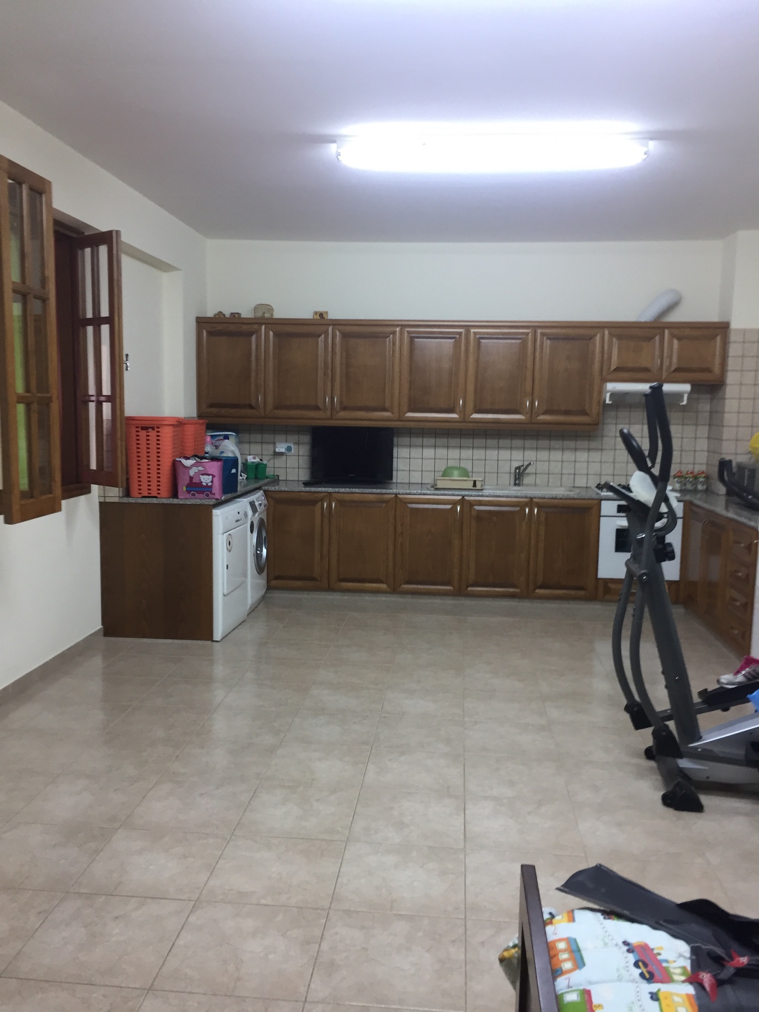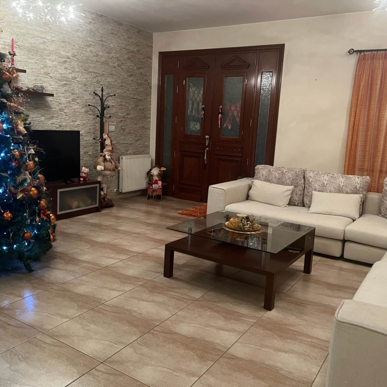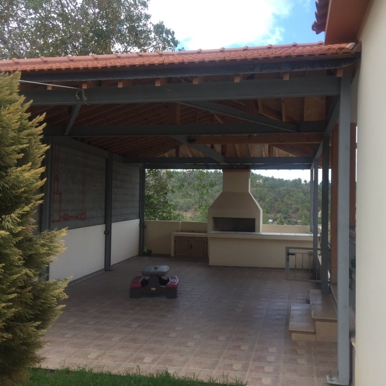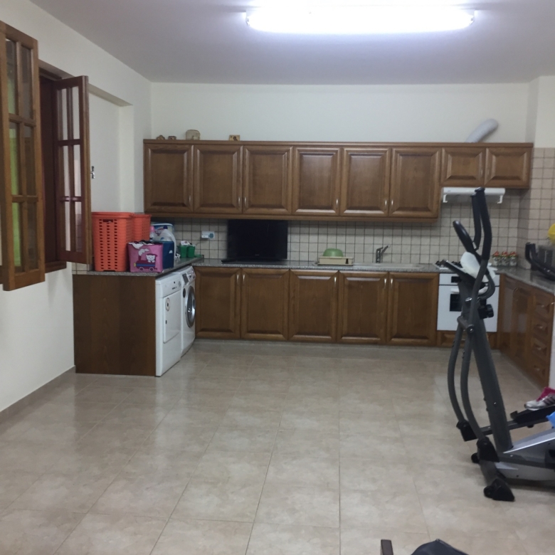 There is a waiting room with a toilet. Next to it there is a huge space which is used as a kitchen and it is connected with a covered garage (100 sqm) with automatic doors, a boiler room and a big storage space. The entrance has an automatic gate. The house has also pressure pump system and alarm system.