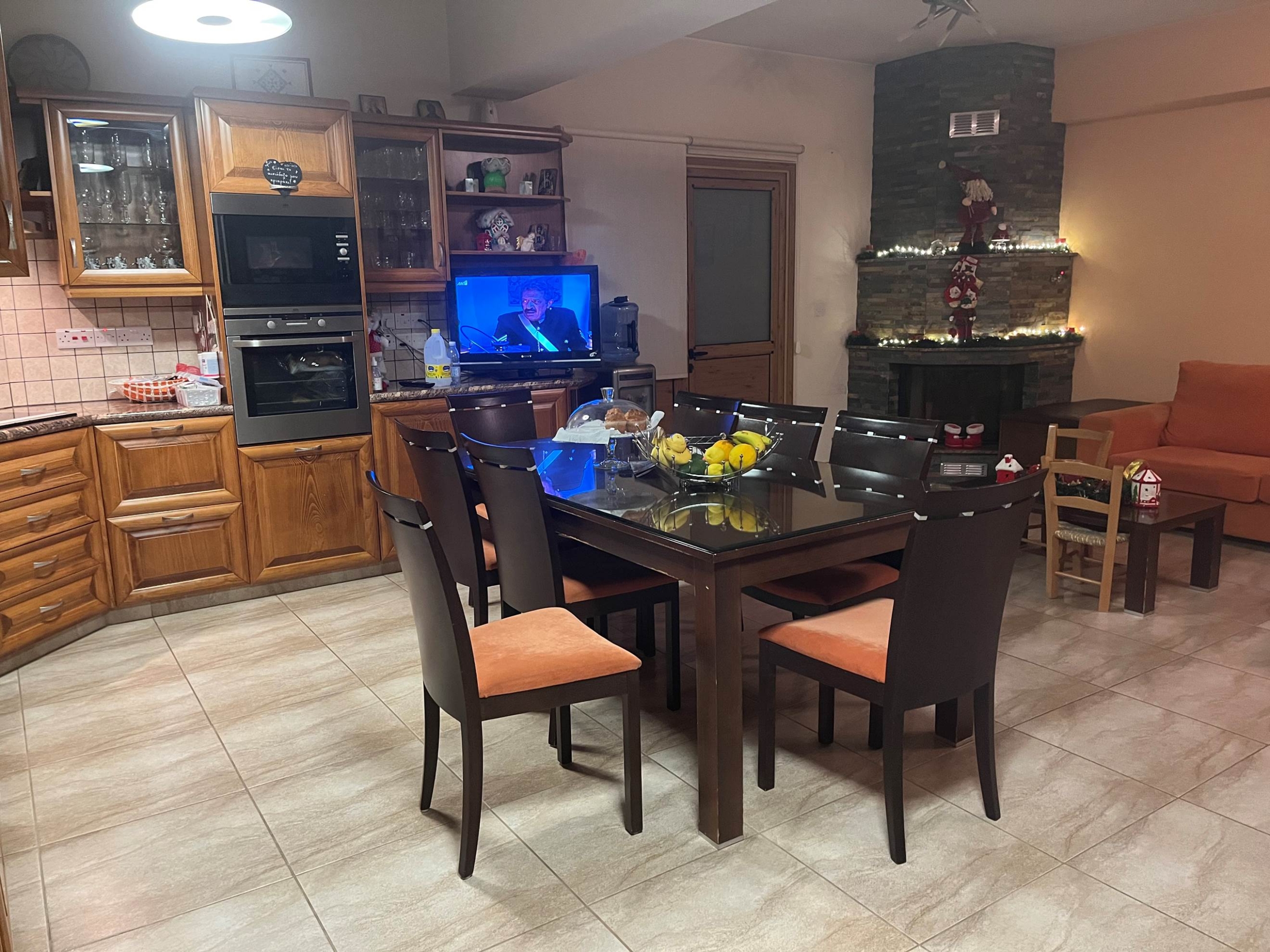The areas of kitchen and living are open plan and very spacious. The kitchen is modern, handmade with wood touches, fully equipped, with fitted appliances. In the kitchen there is also a fireplace which is connected with central heating and the outside door is unique also handmade with wood touches.