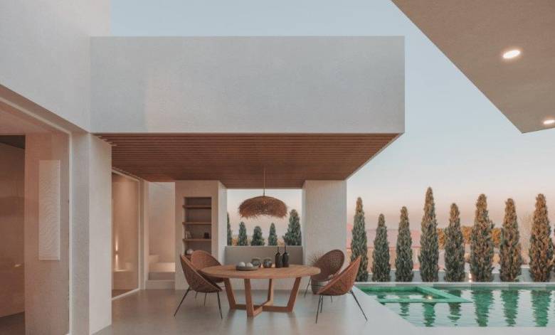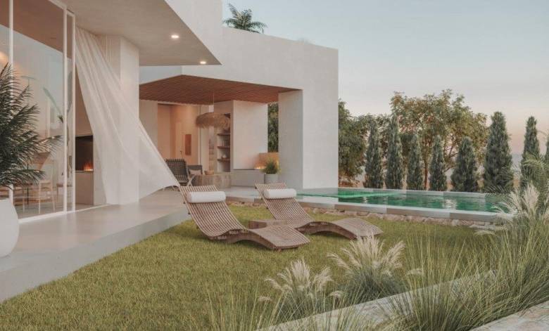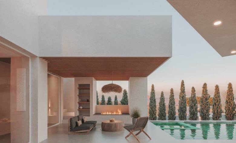 This spacious 4 bedroom home (all en suite), with Six bathrooms, open plan central living area, swimming pool, patio with fire pit and kitchen, internal dining area, office and sauna, has been beautifully designed complimenting the large garden areas. The swimming pool enjoys an integrated jacuzzi and outdoor shower area. There is a garage and security features including an electric gate. The two ground floor bedrooms give you direct access to the garden area, whilst the two first floor bedrooms give you access to 3 large terraces with lovely views of the countryside and the sea beyond.