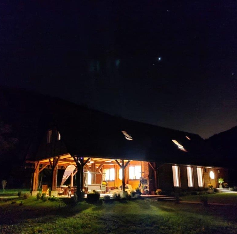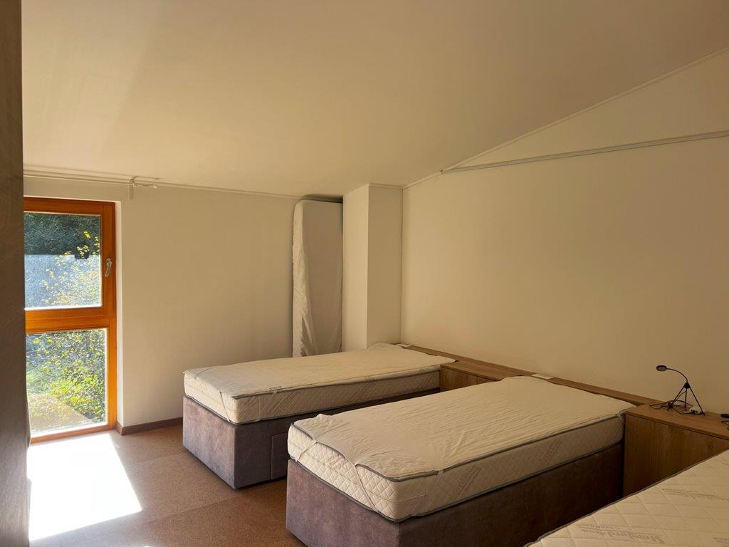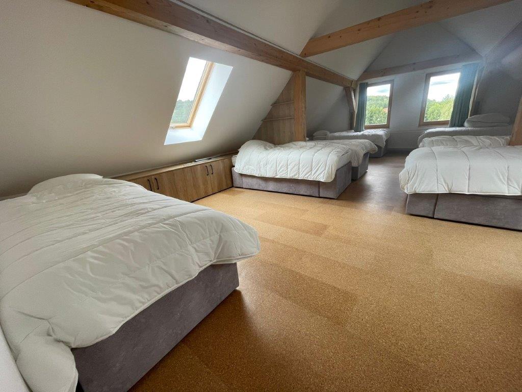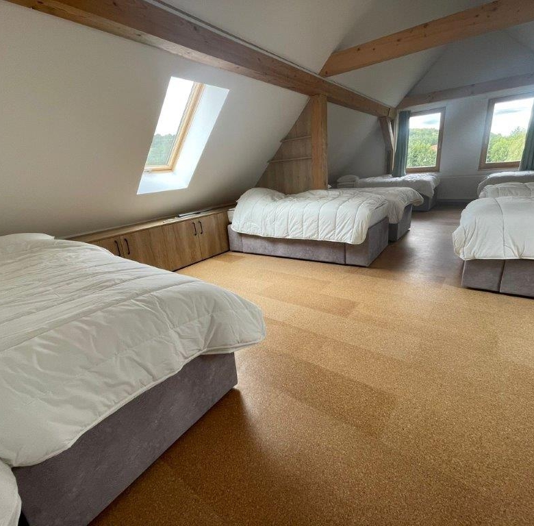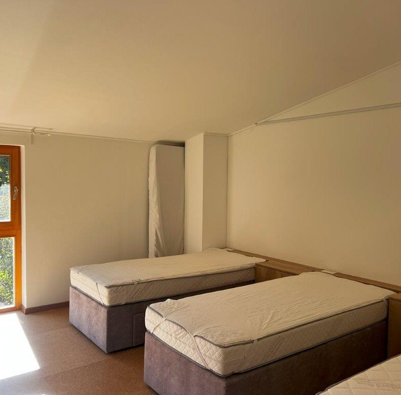 The main building covers an area of 342,80 m2. The ground floor of 187,75 m2 comprises entrance hall, kitchen, yoga room, large room with open fireplace, two toilets (M/F), bathroom with shower, cloakroom and boiler room. The first floor of 155,05 m2 comprises one double room, two triple rooms, a bedroom with eight beds, a bathroom with four showers and four washbasins, three WCs and a common living room.