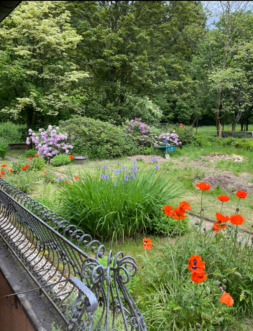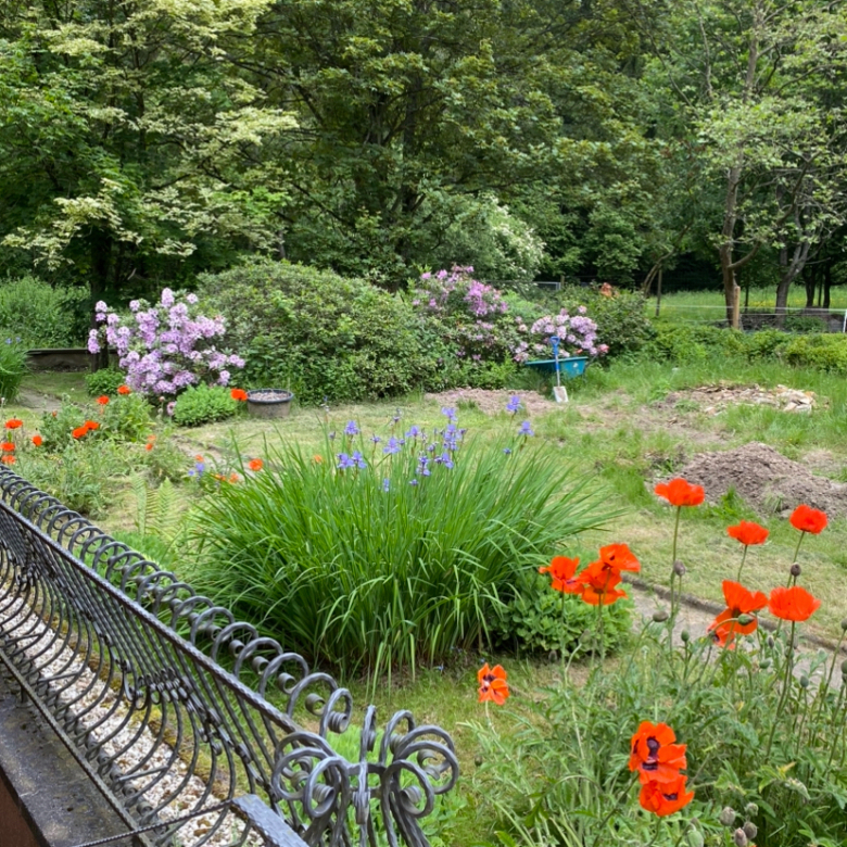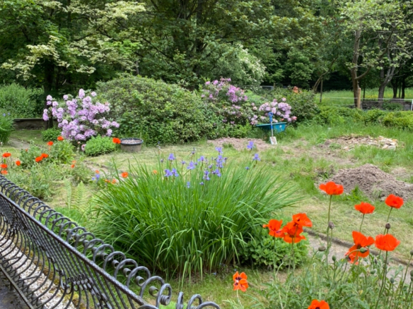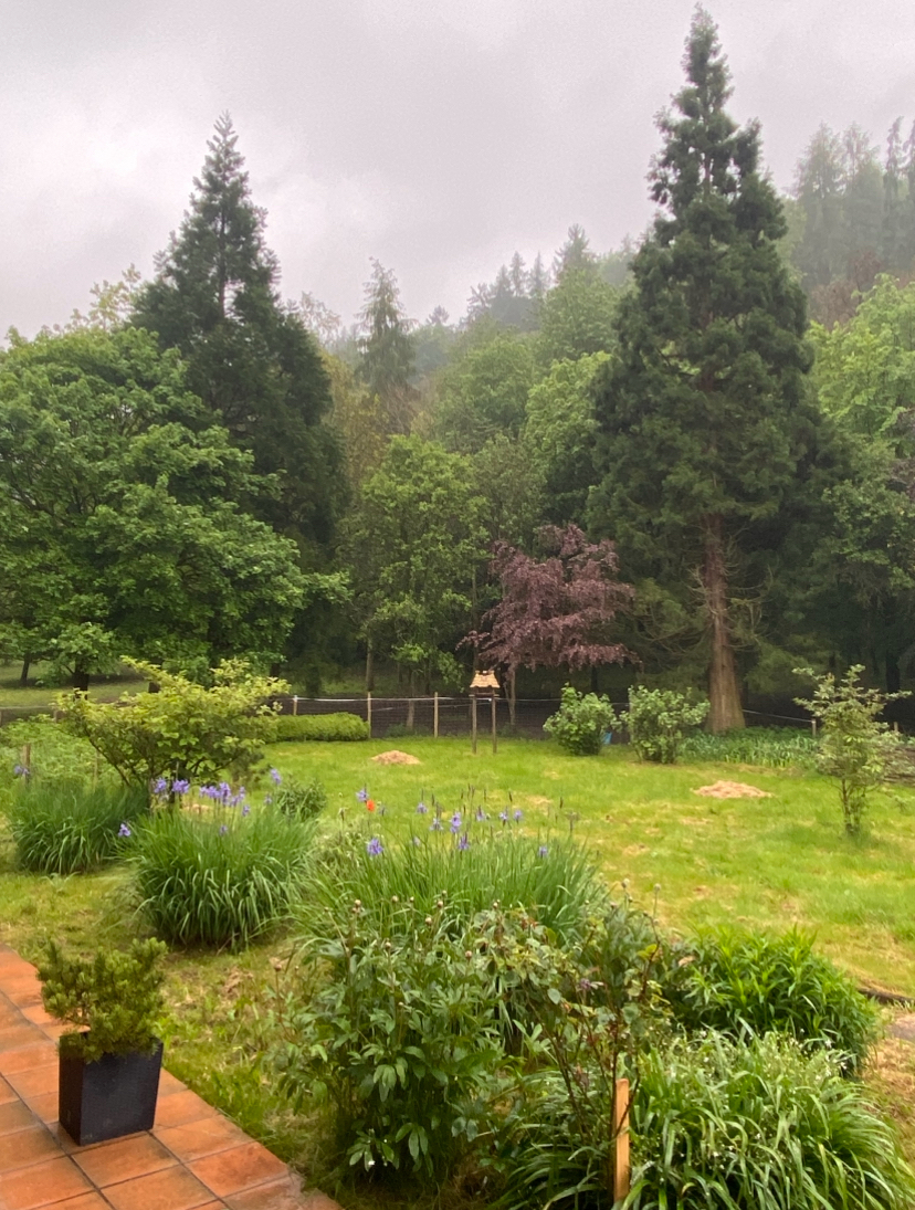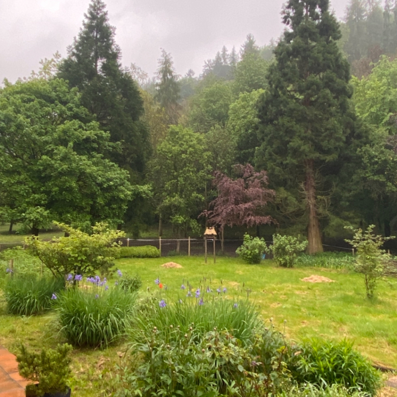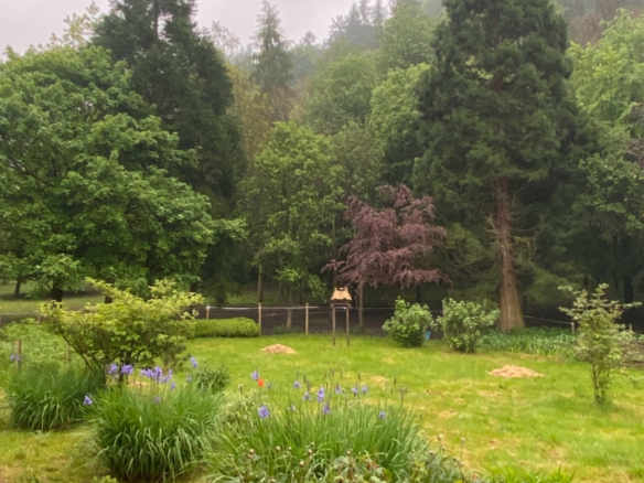 The property sits on a substantial plot of 14,000 square meters (1.4 hectares or roughly 4 acres), giving it a remarkable sense of space and privacy. This expansive land is comprised of an upper and lower meadow, providing vast open areas for various uses. The large garden features mature trees, including majestic Pines and two Redwoods, as well as a charming wooden summer house.