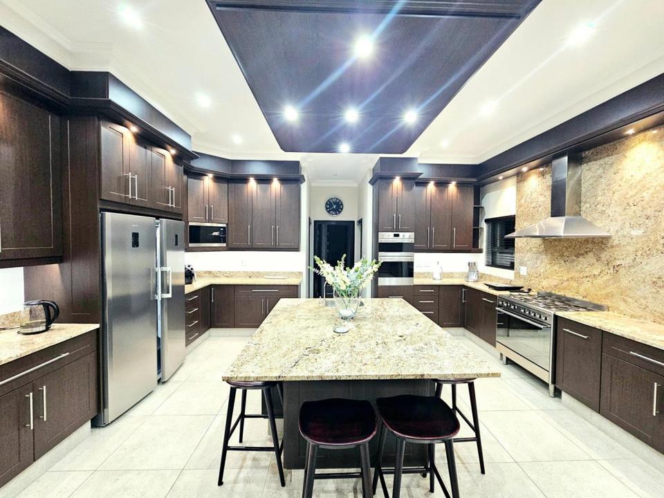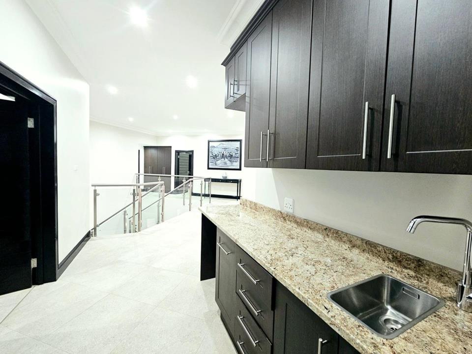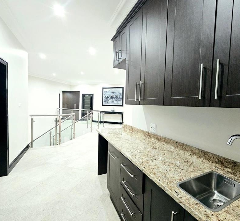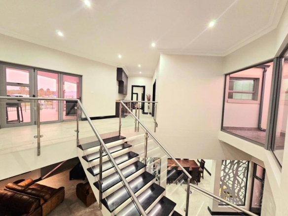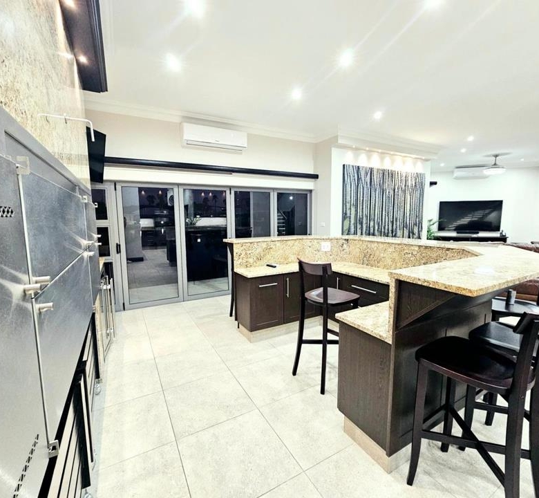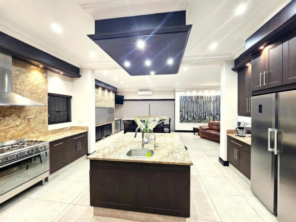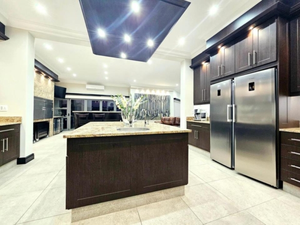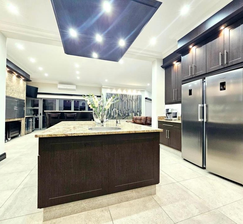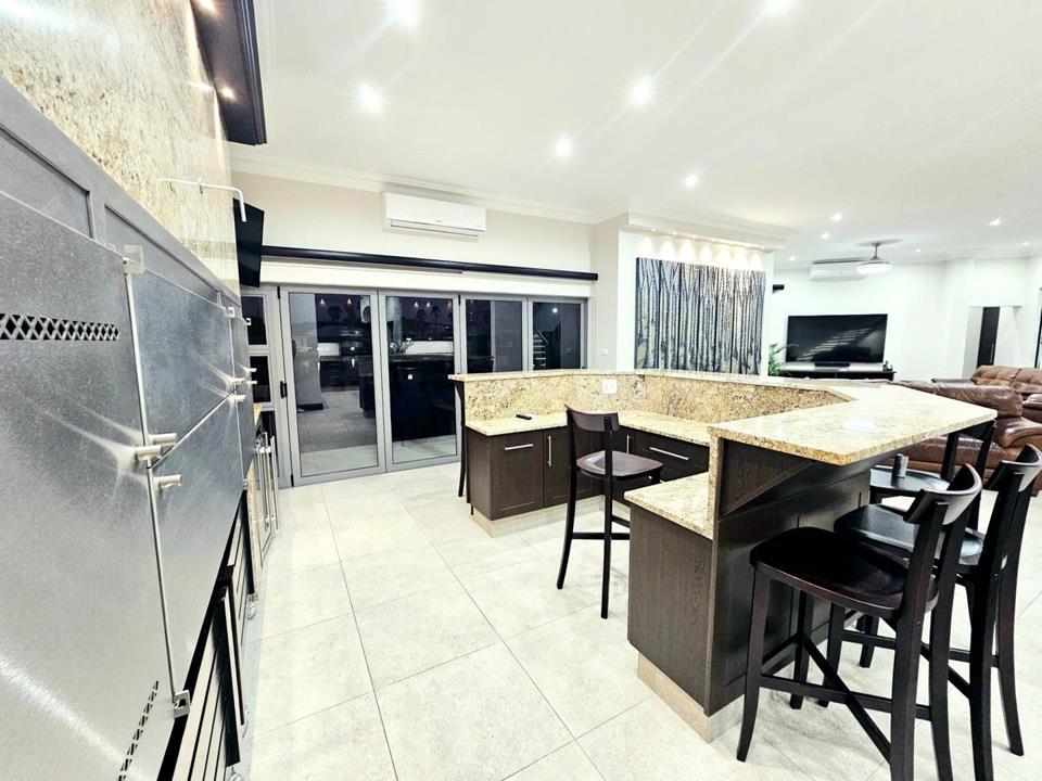 Entering the residence you are met with open plan dining room with a dining table that can sit ten people, stairs with stainless steel balustrades and glass leading to the upstairs and an entertainment area leading to the open-plan kitchen with a separate scullery and pantry, fitted with cupboard from top to bottom with an automated ice machine. The kitchen is fitted with island, SMEG appliances and granite tops throughout the house.
