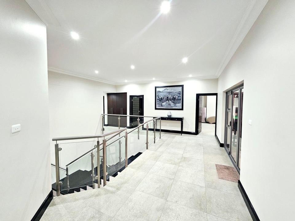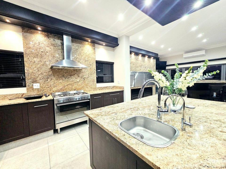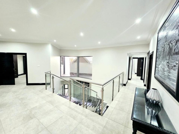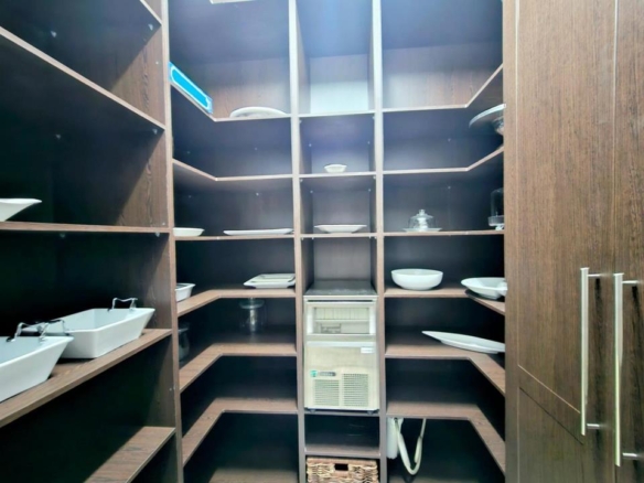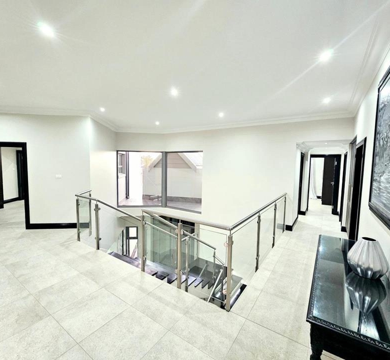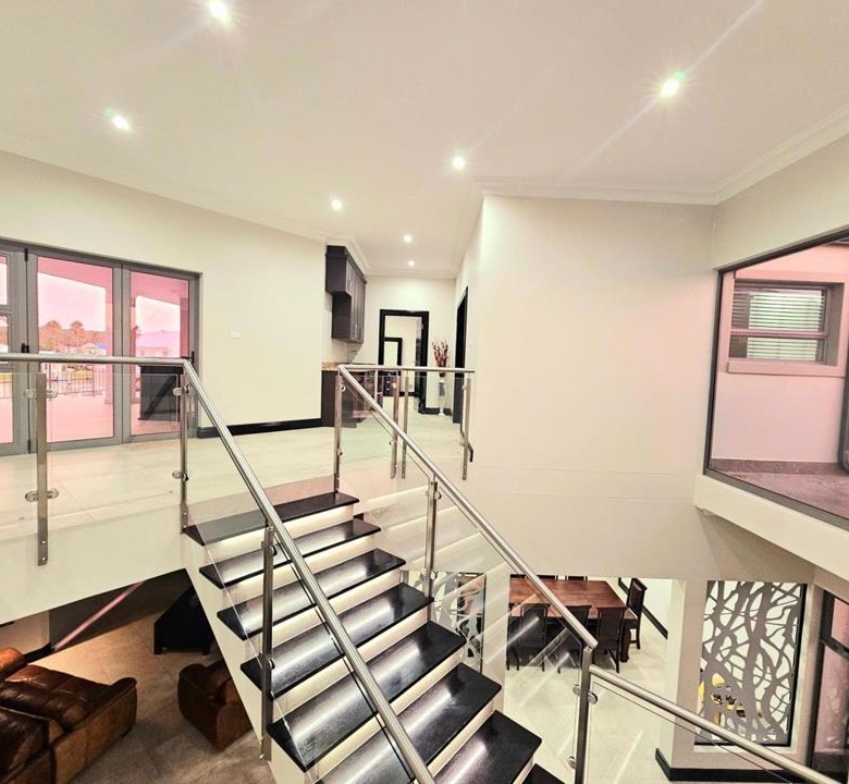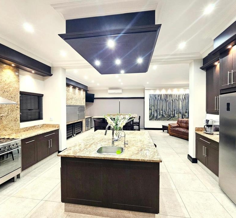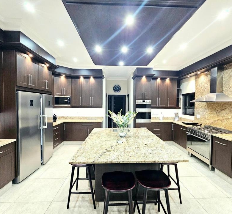 Entering the residence you are met with open plan dining room with a dining table that can sit ten people, stairs with stainless steel balustrades and glass leading to the upstairs and an entertainment area leading to the open-plan kitchen with a separate scullery and pantry, fitted with cupboard from top to bottom with an automated ice machine. The kitchen is fitted with island, SMEG appliances and granite tops throughout the house.