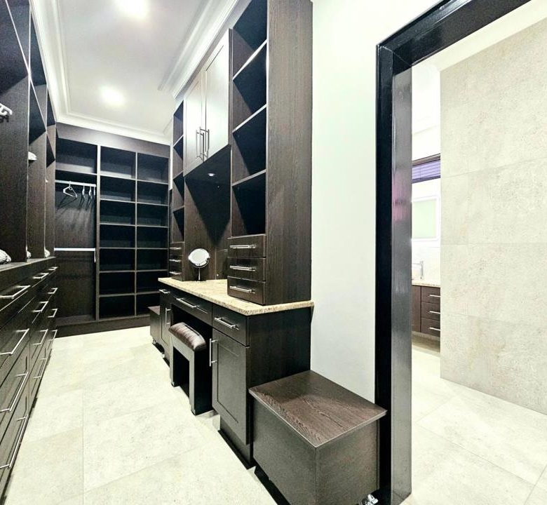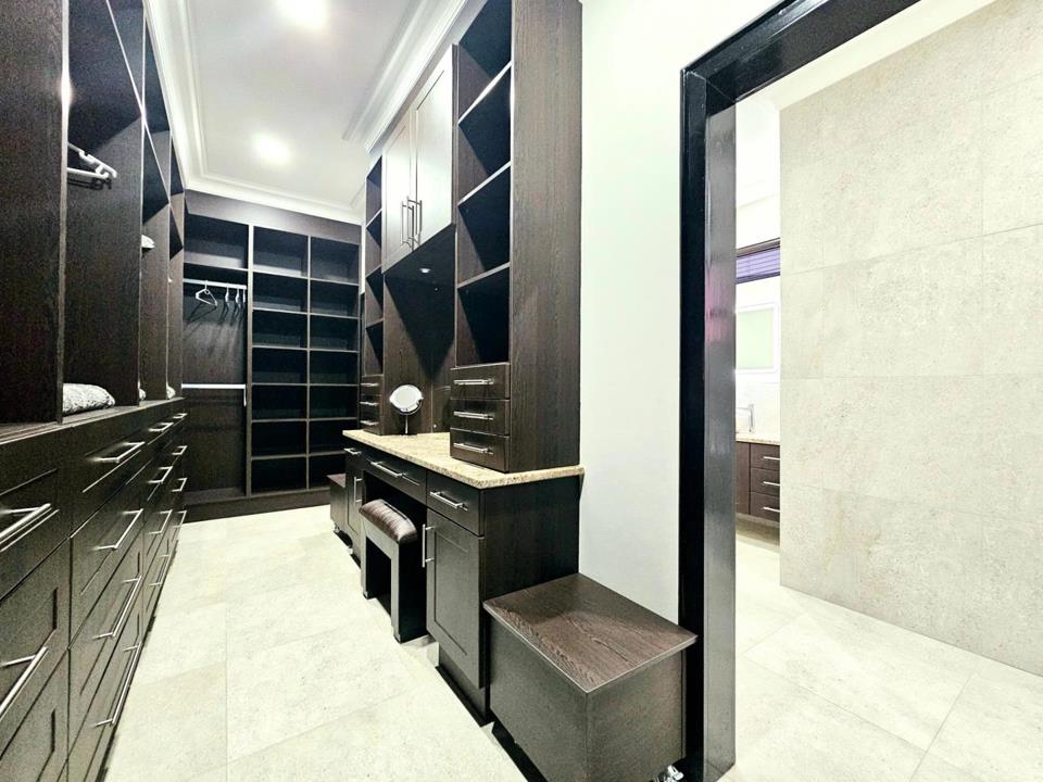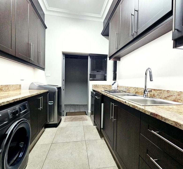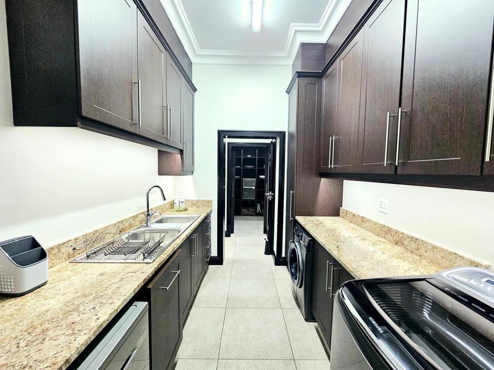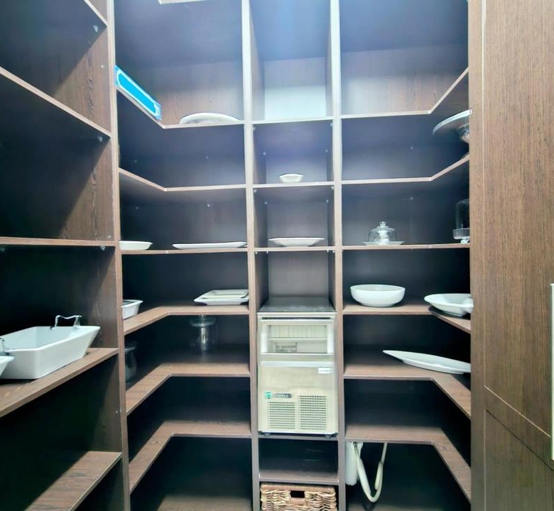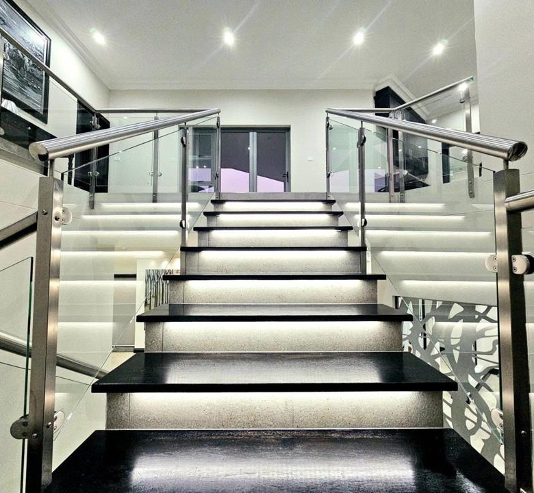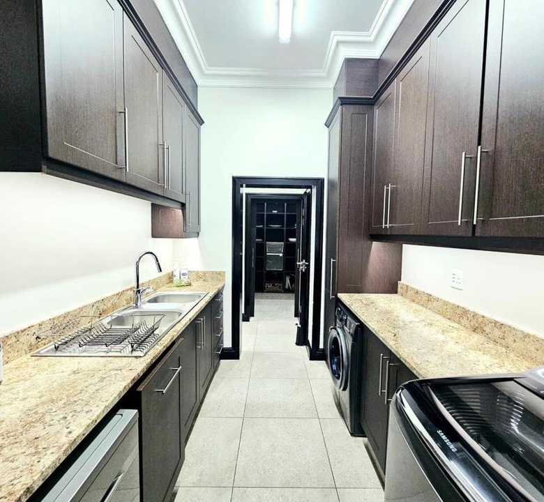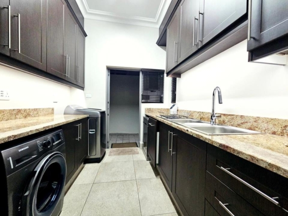 Entering the residence you are met with open plan dining room with a dining table that can sit ten people, stairs with stainless steel balustrades and glass leading to the upstairs and an entertainment area leading to the open-plan kitchen with a separate scullery and pantry, fitted with cupboard from top to bottom with an automated ice machine. The kitchen is fitted with island, SMEG appliances and granite tops throughout the house.