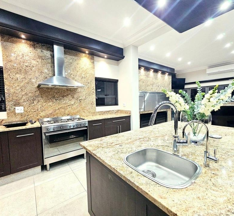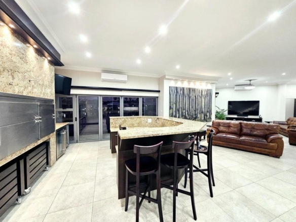 In the entertainment area you will find leather couches, built in stainless gas and wood braai fitted with lights and electrical rotisserie.