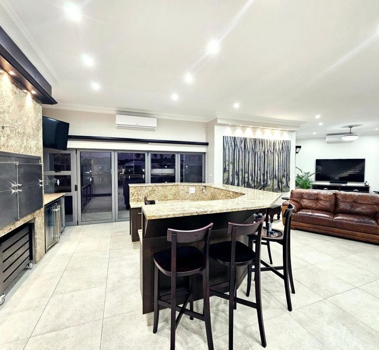 Walking through the aluminium stacker doors you are met with the view of the canals with a built in boma with fire place to entertain friends and family next to the water with private docking space for your boat should you desire.