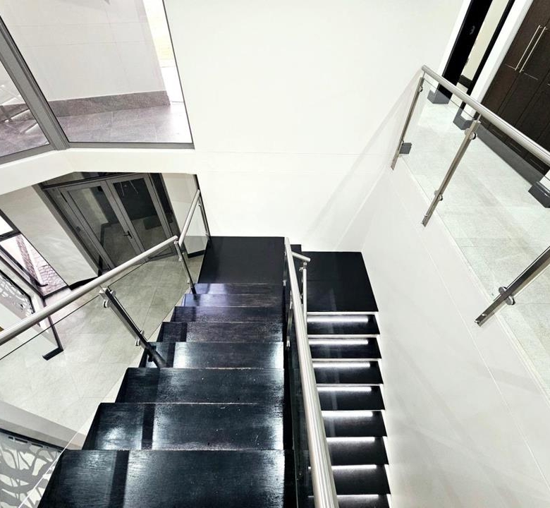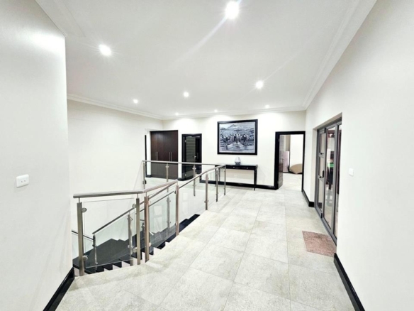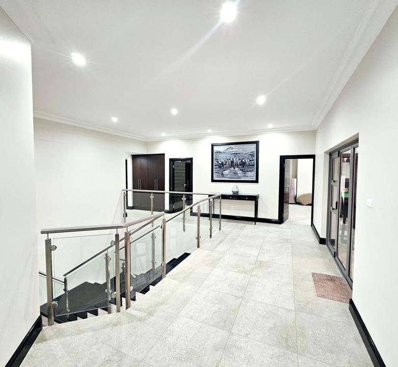 Driving into the property you are met with a big paved driveway leading to the main entrance with parking space for ten or more cars. On both sides of the main entrance, you will find 6 spacious garages fitted with automated wooden garage doors, all tiled floors with ample built-in cupboard storage space. In the front of the driveway, you will find a big communal green area, with a big lawn.