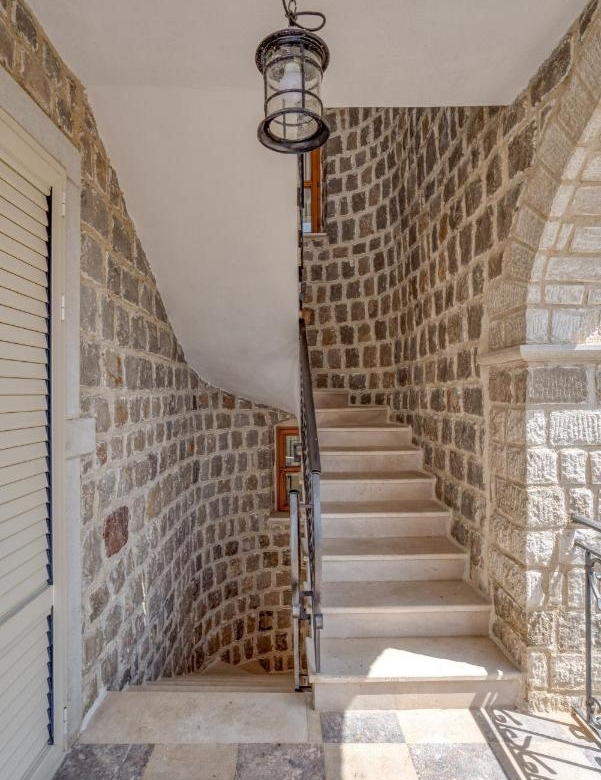 Villa Olive Grove is a testament to authentic Mediterranean architecture, constructed using traditional local materials, predominantly stone and wood. The villa’s design seamlessly integrates with the surrounding landscape, reflecting the natural beauty of the Montenegrin coast. The carefully designed interior complements the exterior’s rustic charm, creating a warm and inviting atmosphere. The use of natural materials throughout the villa enhances its character and contributes to a sense of timeless elegance.