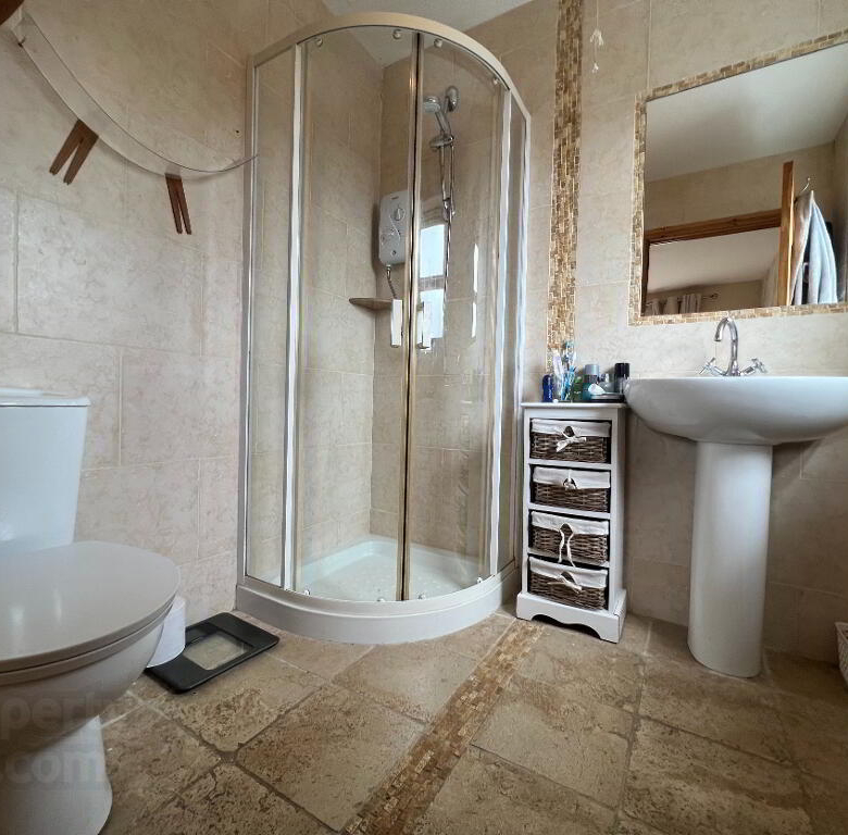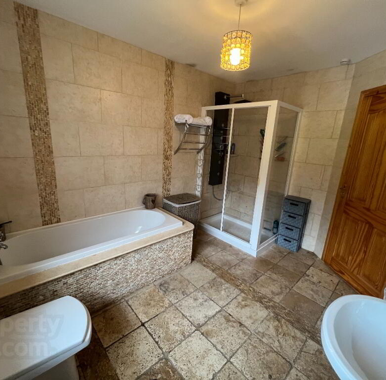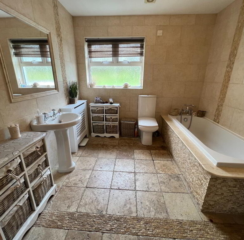 4 piece suite comprising of bath tub WC, wash hand basin and rainfall shower. Fully lined walls and flooring, large resist wall mirror.