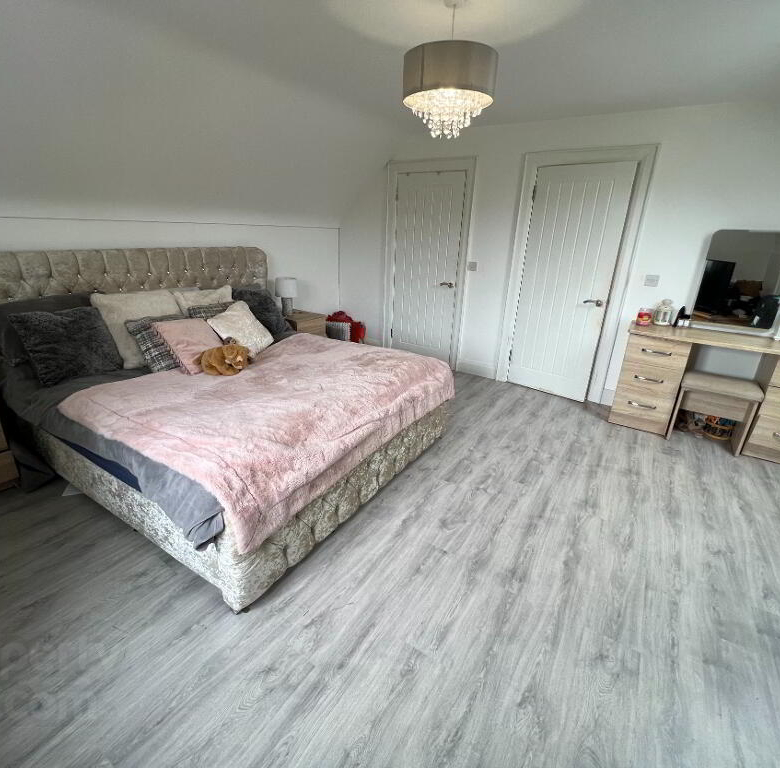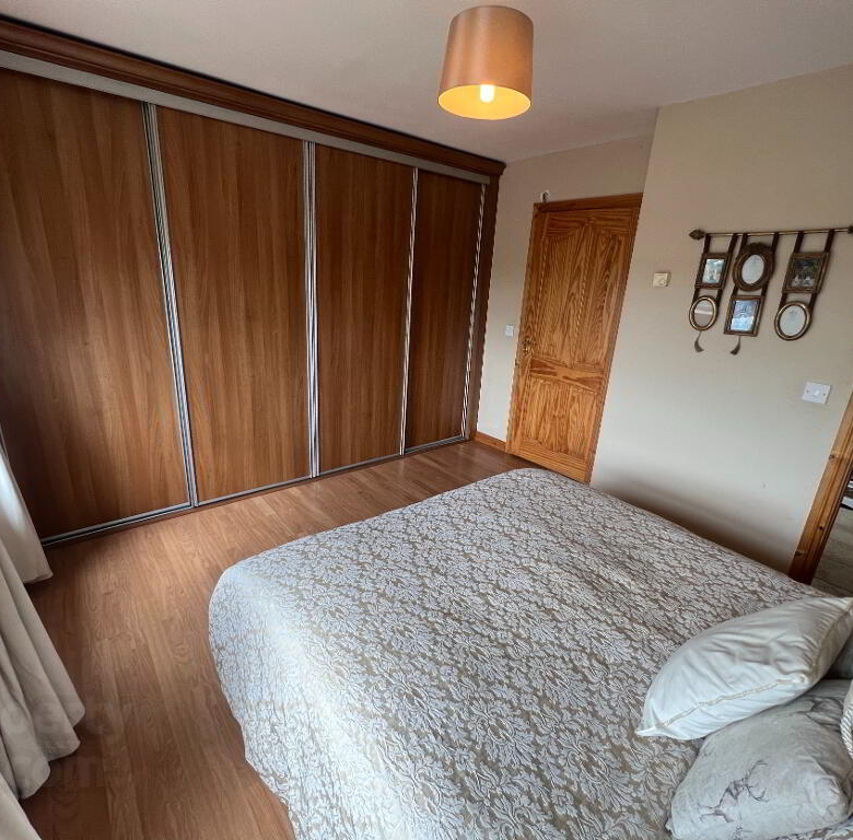 Large double bedroom with built in sliding wardrobes, wooden style flooring and a three piece en suite comprising of WC, wash hand basin and electric shower.