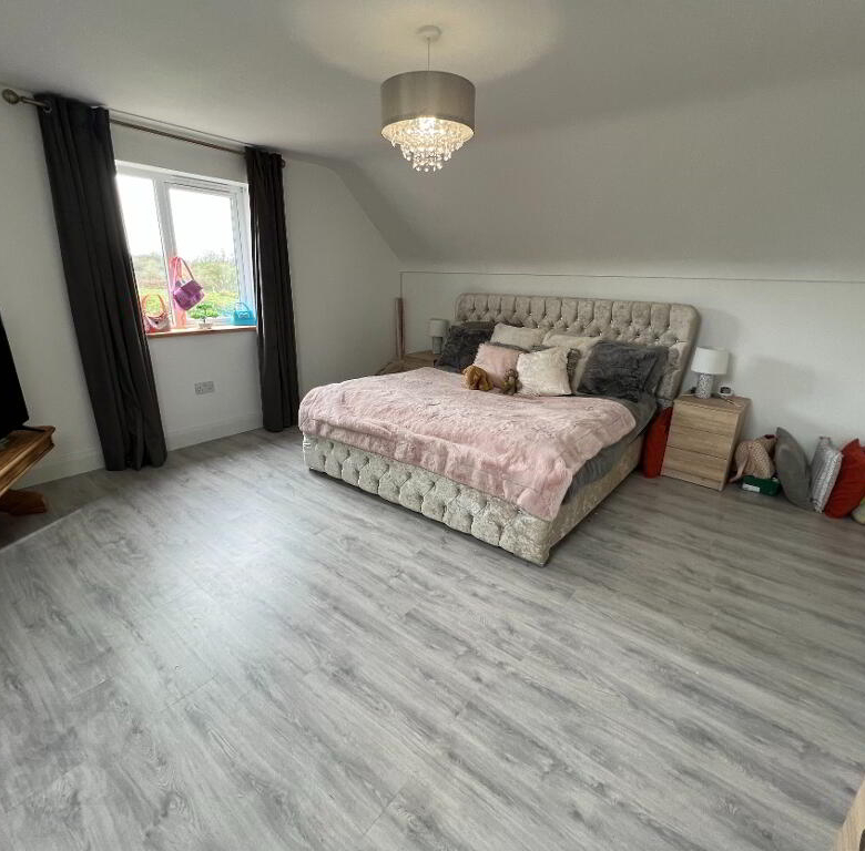 Large double bedroom with ample wardrobe space and wooden style flooring.