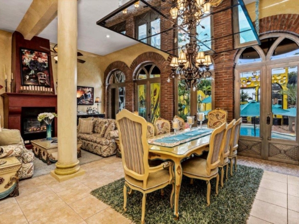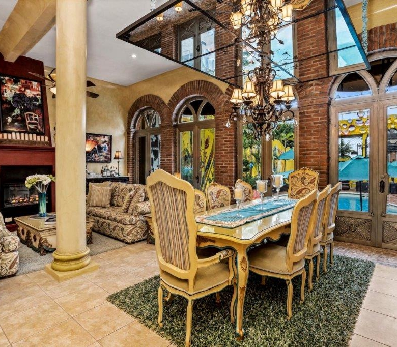 Located outside one of the five tall, iron doors leading to the pool, is the 5 to 6 person ‘floating glass elevator’, called ‘Almost Famous’, complete with an 8 light chandelier, that can take you and your guests from all levels to any floor.