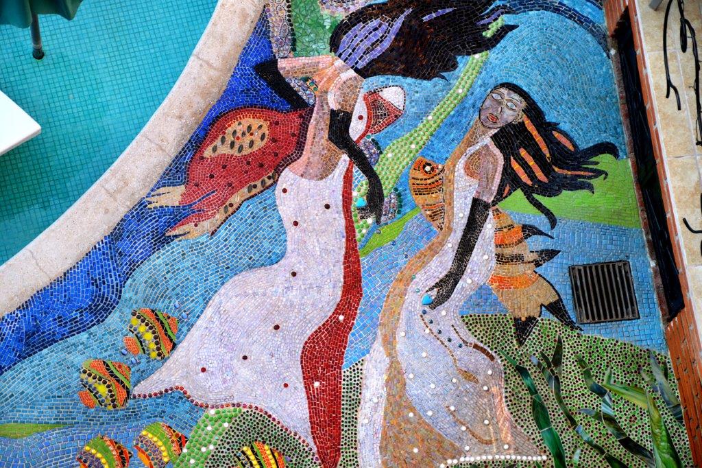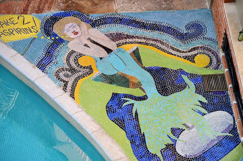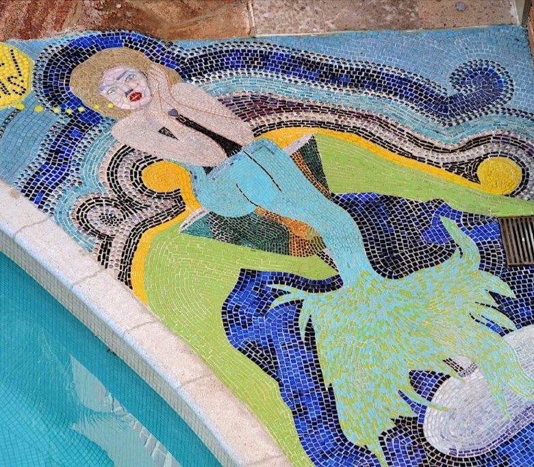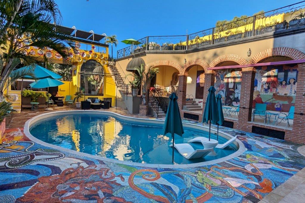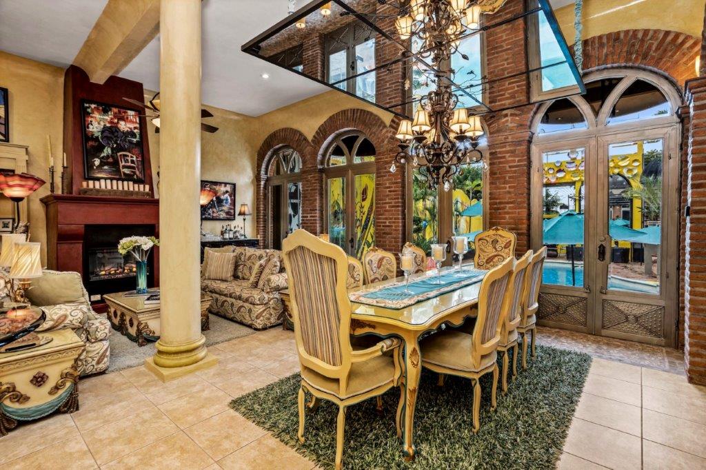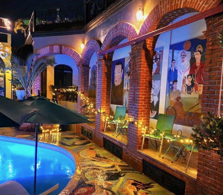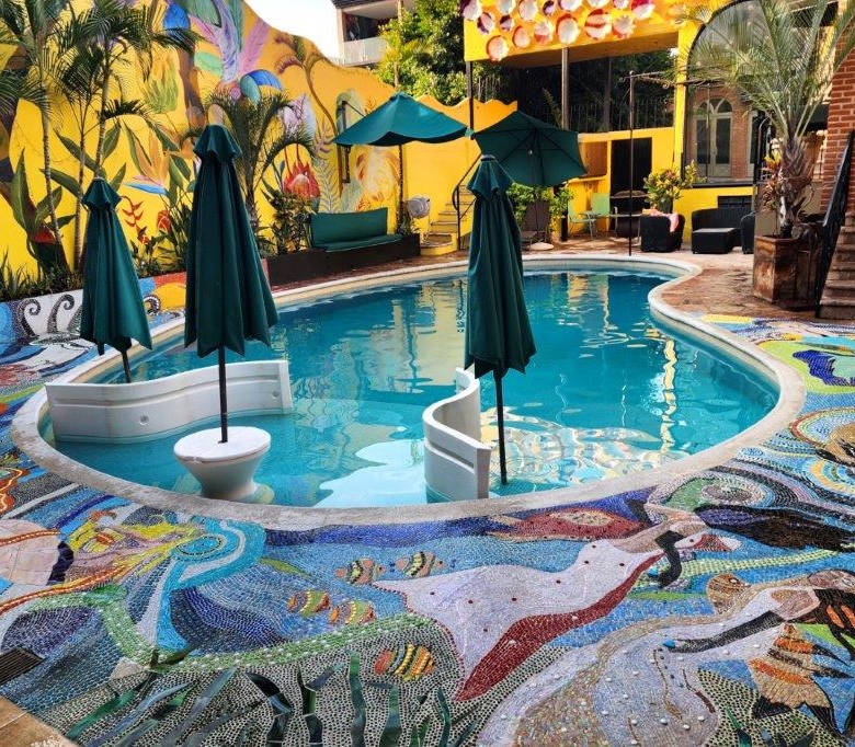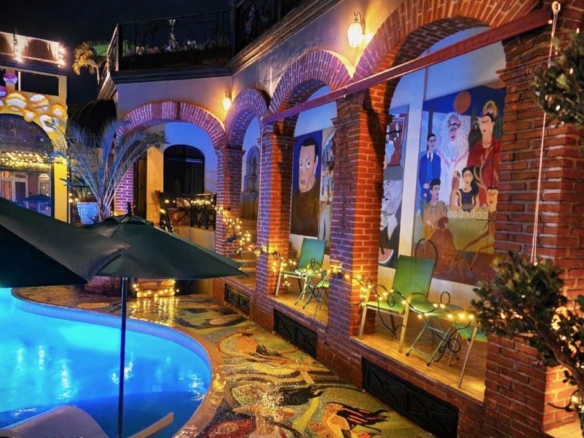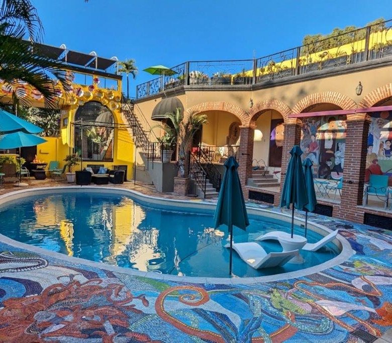 These exquisite doors open onto the brand new pool, re-done in 2023 to have a lounging ledge and comes with the official ledge loungers, table and three Sunbrella custom umbrellas for your pleasure. The captivating main level two bedrooms, entered through arched, solid wood, ten feet tall doors and both with fireplaces, A/C splits, en-suite baths, king size beds with luxurious bedding, upholstered chairs, closets, great art, full rugs, windows shades as well as blackout draperies, hidden kitchenettes, and wall safes, flow out to the great room greeting table that focuses your eye toward the massive handcrafted 9′ wide from counter top to ceiling, Aromi Della Cucina custom kitchen hood over the 6′ wide commercial range in this over-sized kitchen with movable island, pass through window to the patio, and a full, three sided walk-in pantry, a dining area with an exquisite custom made table in Tlaquepaque that seats eight with a suspended, breathtaking dropped art mirror highlighted by the Kathy Ireland chandelier hung through it’s center, and the hidden TV in a separate seating area which leads you from the main level toward the beautiful new kidney shaped pool and the ‘four years in the making’ custom colored glass Mermaid Mosaic pool surround; the hydro spa, the fire pit, the eye popping 25′ high east wall mural, the center floating plates painted to represent a sunrise or sunset and the custom painted Frida Kahlo and Diego Rivera west walkway murals that flow off the covered patio with one of the seven fireplaces and a fully equipped second outdoor kitchen and eating area for up to 8 persons.