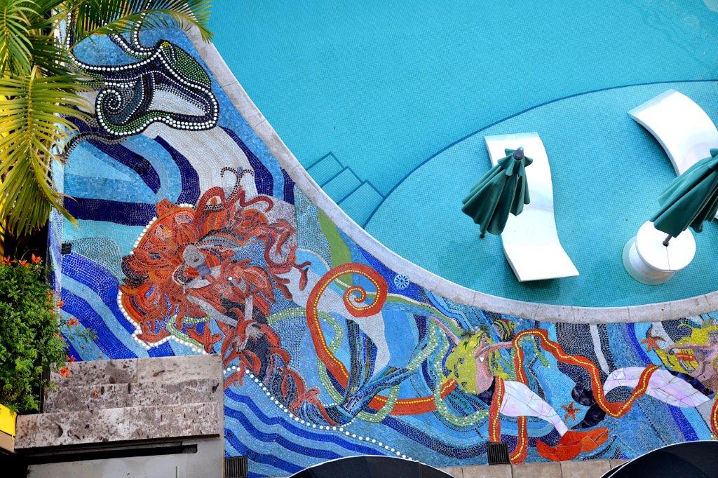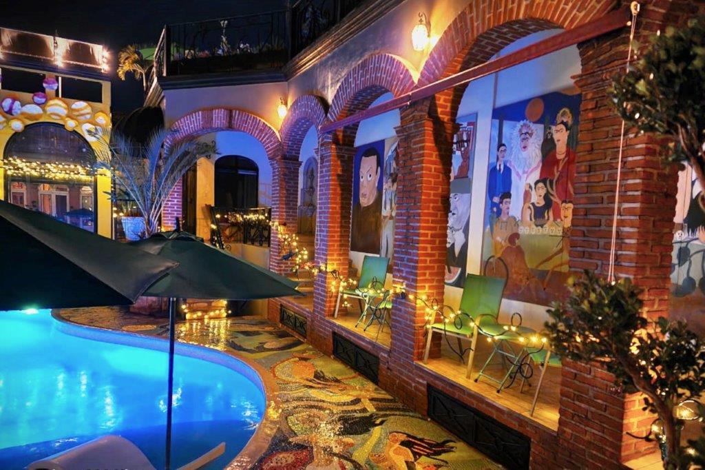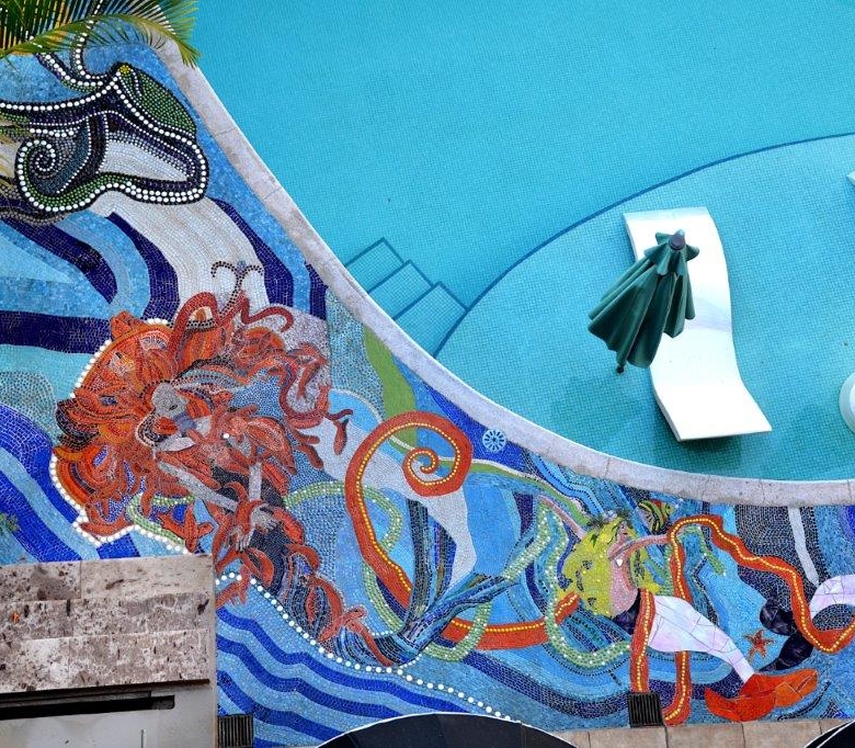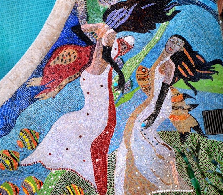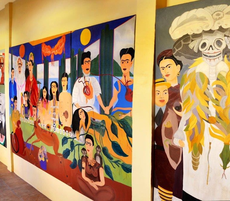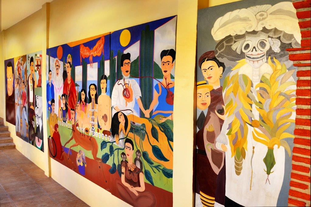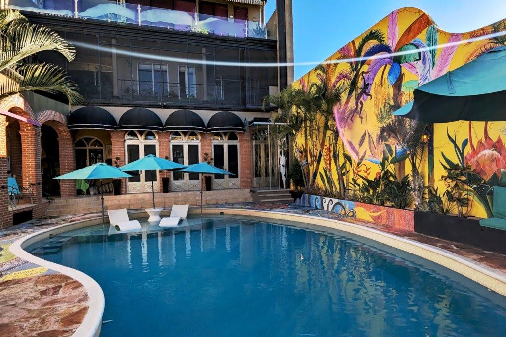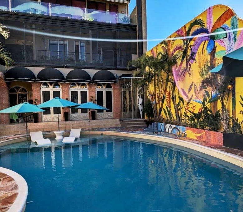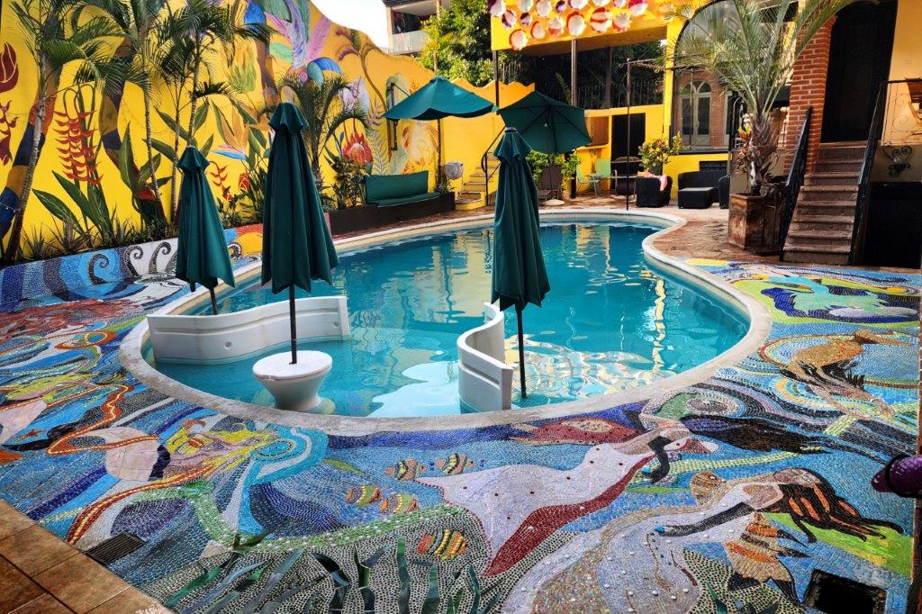 These exquisite doors open onto the brand new pool, re-done in 2023 to have a lounging ledge and comes with the official ledge loungers, table and three Sunbrella custom umbrellas for your pleasure. The captivating main level two bedrooms, entered through arched, solid wood, ten feet tall doors and both with fireplaces, A/C splits, en-suite baths, king size beds with luxurious bedding, upholstered chairs, closets, great art, full rugs, windows shades as well as blackout draperies, hidden kitchenettes, and wall safes, flow out to the great room greeting table that focuses your eye toward the massive handcrafted 9′ wide from counter top to ceiling, Aromi Della Cucina custom kitchen hood over the 6′ wide commercial range in this over-sized kitchen with movable island, pass through window to the patio, and a full, three sided walk-in pantry, a dining area with an exquisite custom made table in Tlaquepaque that seats eight with a suspended, breathtaking dropped art mirror highlighted by the Kathy Ireland chandelier hung through it’s center, and the hidden TV in a separate seating area which leads you from the main level toward the beautiful new kidney shaped pool and the ‘four years in the making’ custom colored glass Mermaid Mosaic pool surround; the hydro spa, the fire pit, the eye popping 25′ high east wall mural, the center floating plates painted to represent a sunrise or sunset and the custom painted Frida Kahlo and Diego Rivera west walkway murals that flow off the covered patio with one of the seven fireplaces and a fully equipped second outdoor kitchen and eating area for up to 8 persons.