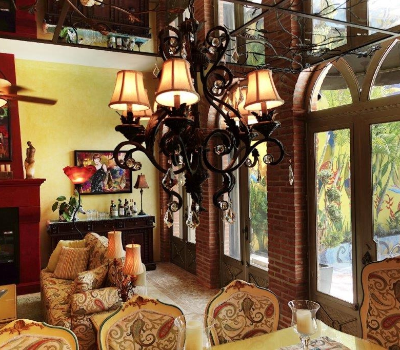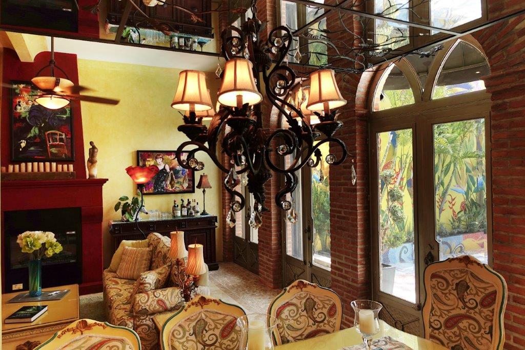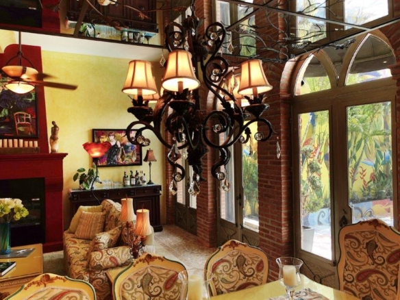 Each room has a distinct personality that reflects the owners Italian and British heritage. There is nothing that has not been meticulously thought-out and incorporated to enhance your day to day living experience. Each room has eye catching focal points. Even the entrance hall from the street has a 13th century, hand cut stone mosaic that subtlety blends into the tile work. It might be hard to look down, as most certainly your eyes will want to soak up the soaring thirteen and half foot ceilings with curved European coping that distinguish Bellissima from 99% of the homes in all of Mexico. Once you’ve taken in this expansive feeling, you cannot help but be taken back by the floor to ceiling fireplace mantel and then to the five extraordinary, handcrafted, ten feet tall, iron, arched doors with beveled glass, surrounded by exposed brick to off set the Venetian plaster style wall finish throughout most of this remarkable home.