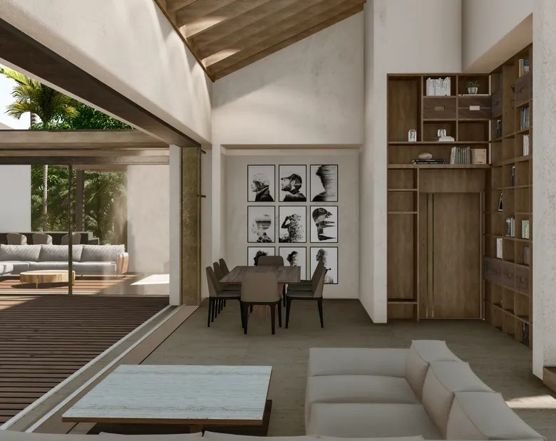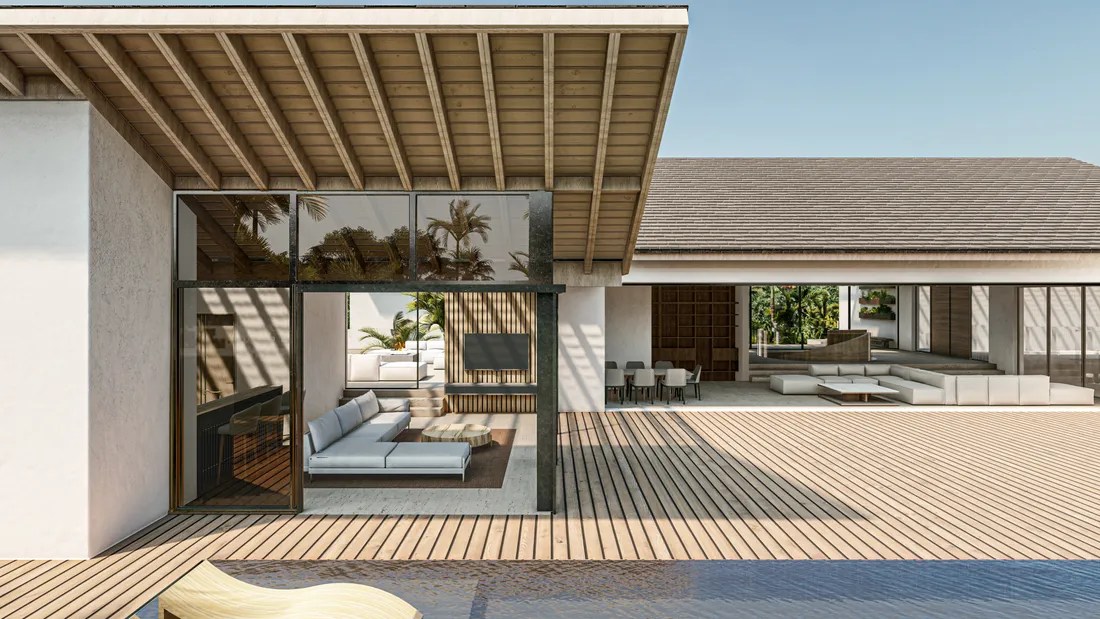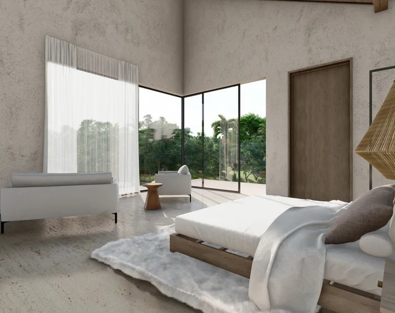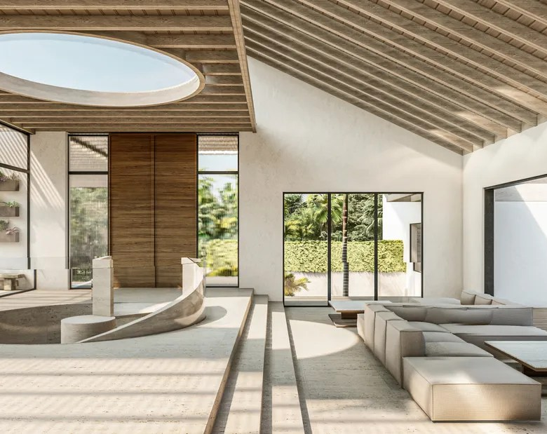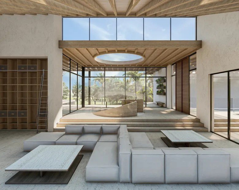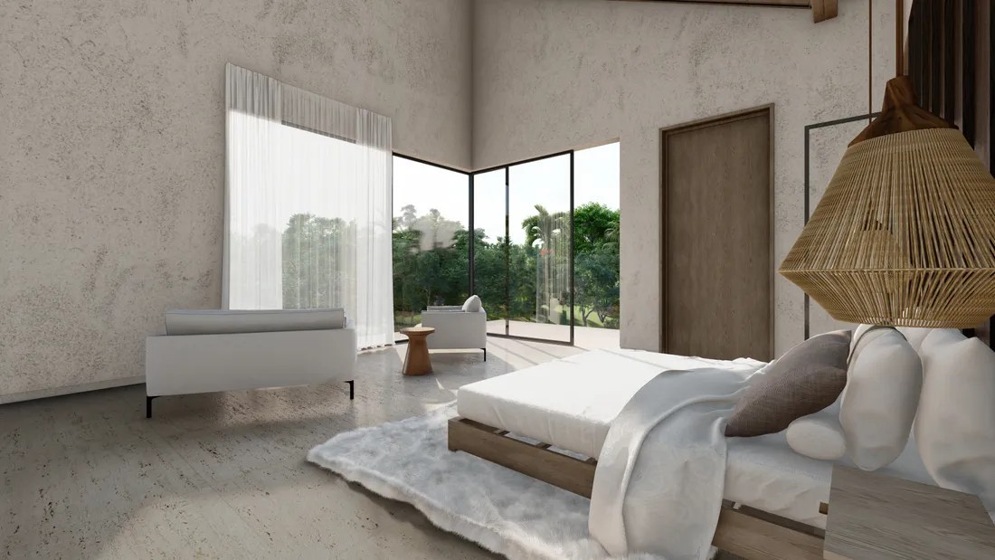 The interior design reflects a similar aesthetic, featuring minimalist furnishings, neutral color palettes, and natural textures. The emphasis on open spaces and natural light creates an ambiance of serenity and tranquility.