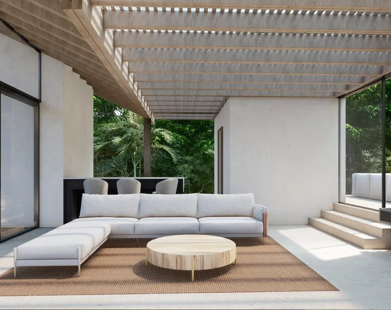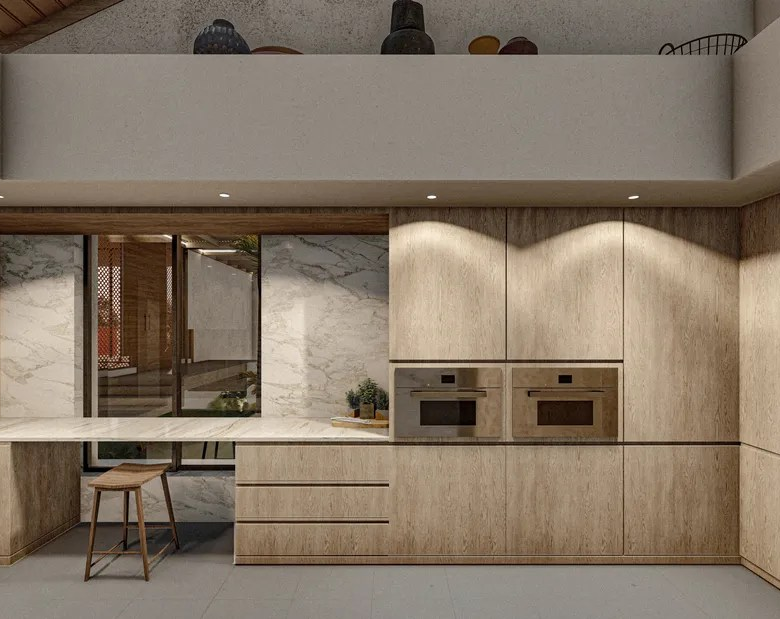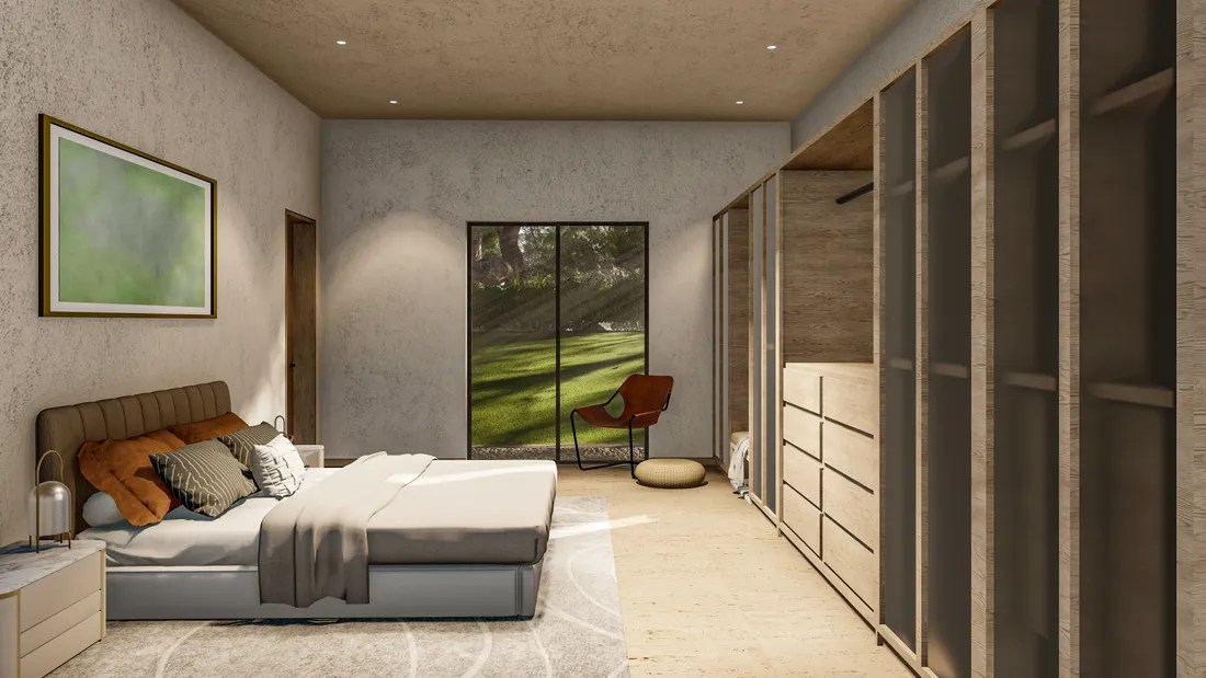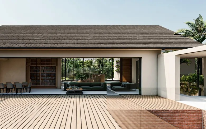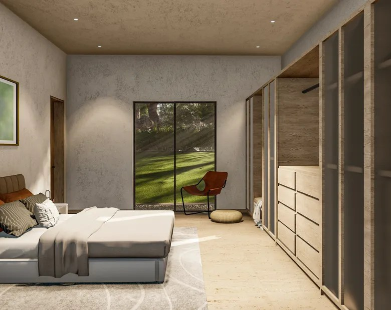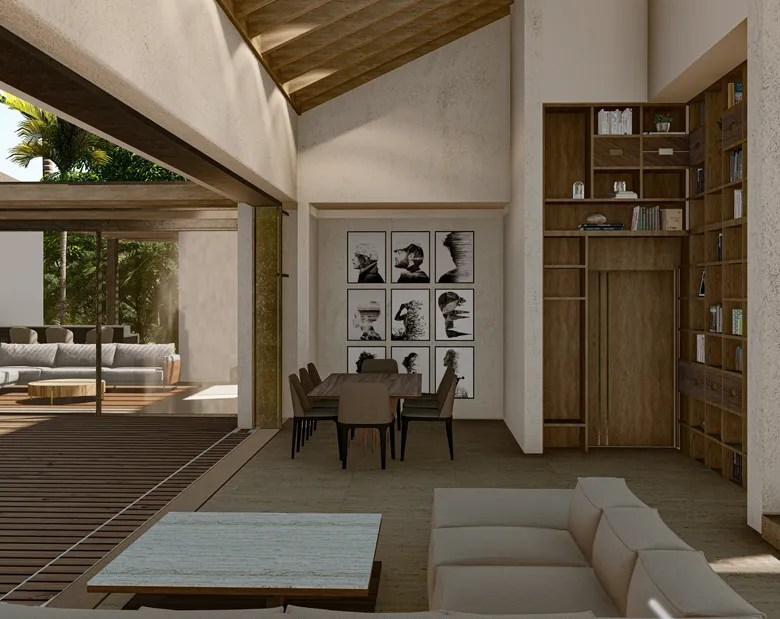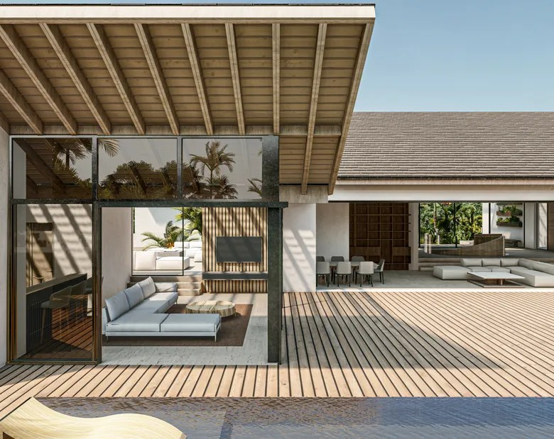 The interior design reflects a similar aesthetic, featuring minimalist furnishings, neutral color palettes, and natural textures. The emphasis on open spaces and natural light creates an ambiance of serenity and tranquility.