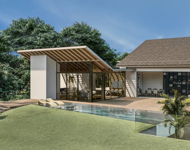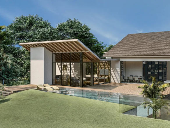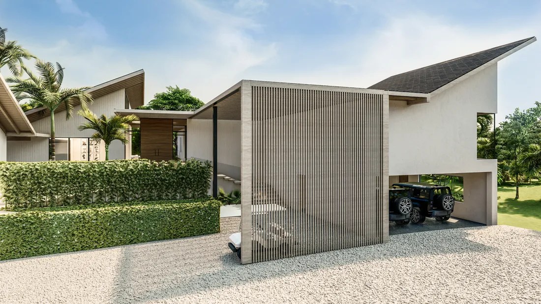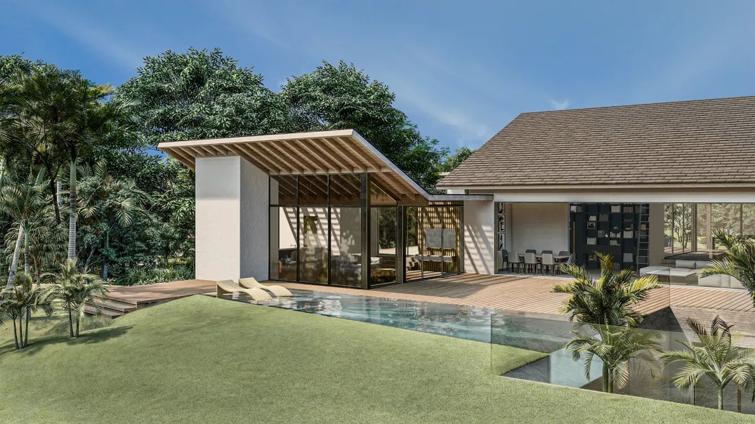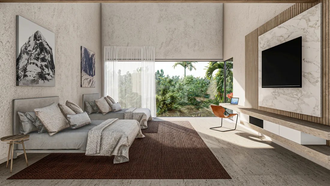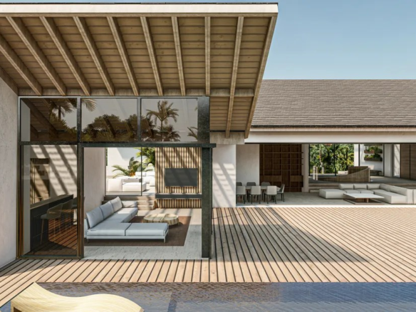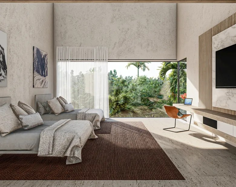 The villa’s architectural design embodies the principles of modern tropical minimalism, emphasizing clean lines, natural materials, and a seamless integration with the surrounding environment. The use of local stone, hardwoods, and glass creates a harmonious blend of contemporary elegance and Caribbean warmth.