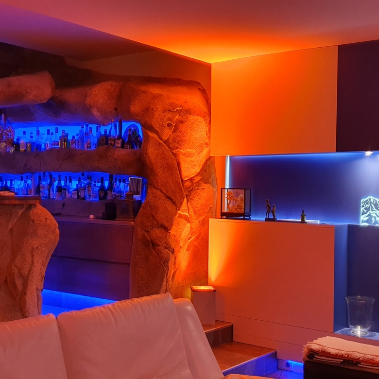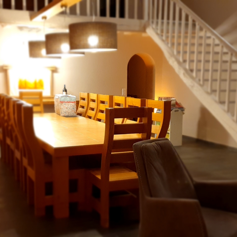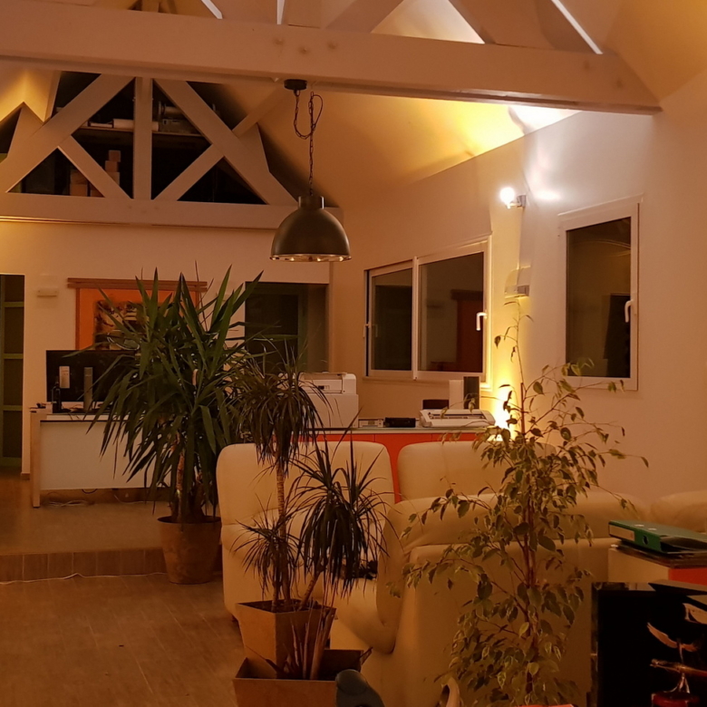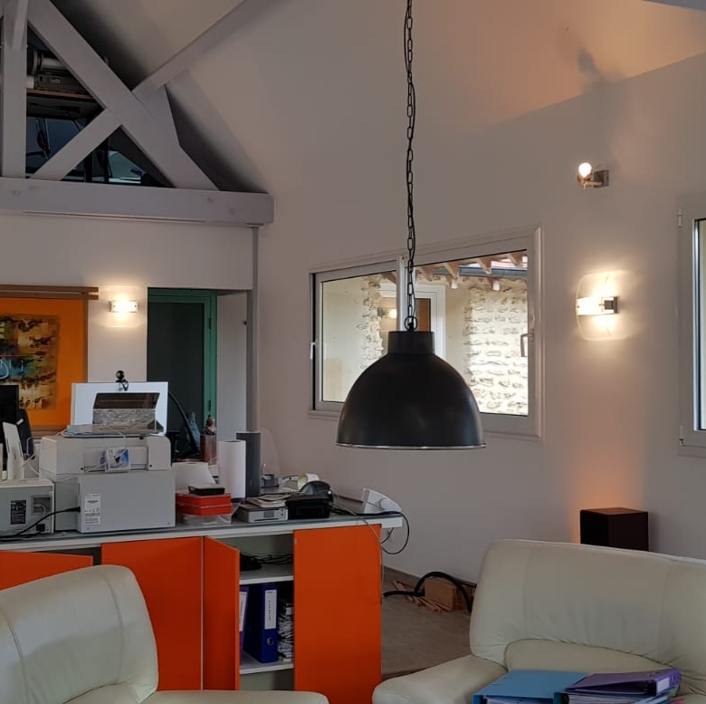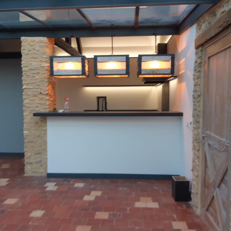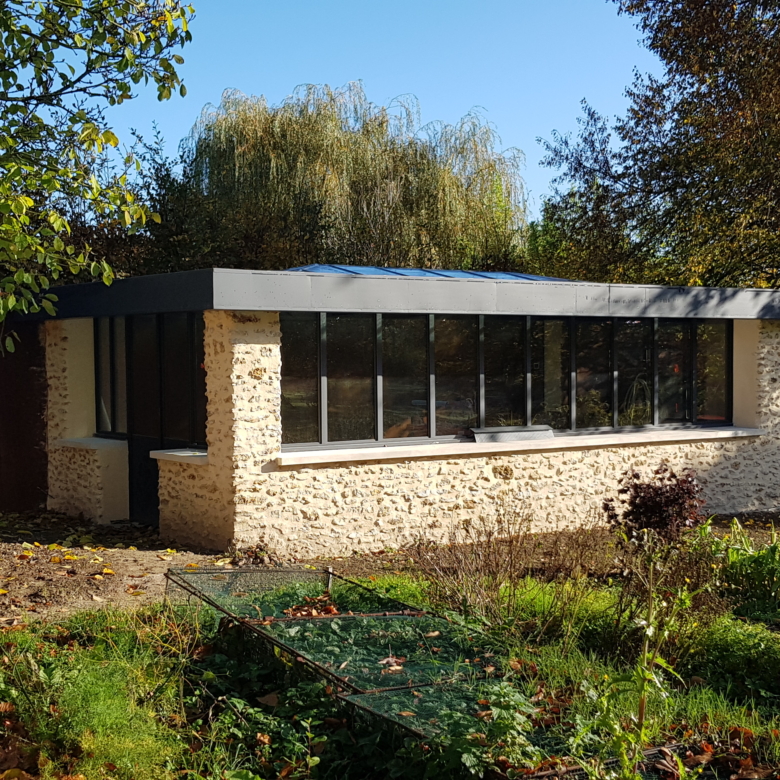 The second home at 3 bis rue de la Noue comprises a rehabilitated old barn and a new section built in 2019-2020. The new section features multi-cellular brick walls, insulation, and underfloor heating by electric mesh. The kitchen is fully electric.