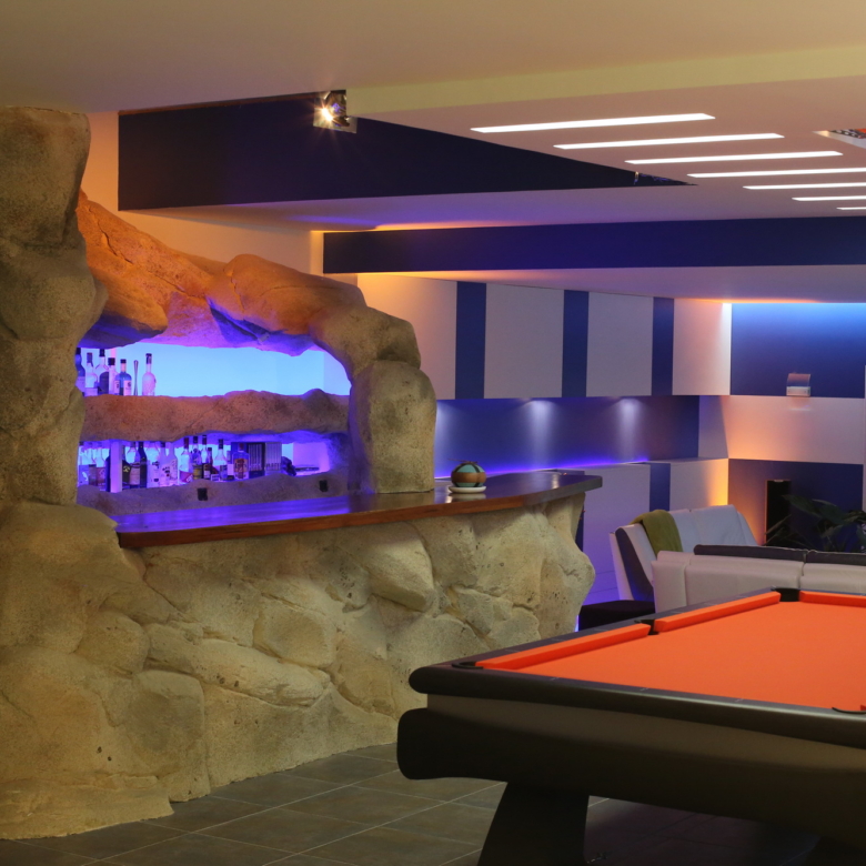 The central part and left wing comprise the main living areas, offering a luxurious and comfortable environment for family and guests. The ground floor features an elegant entrance with a cloakroom and separate toilet, a laundry room, a spacious living room with a bar, billiards, and a TV area, a large open kitchen (75 square meters) with a pantry, a cathedral dining room with a fireplace, and a master suite (50 square meters) with an independent garden entrance, dressing room, bedroom, private bathroom, and toilet.