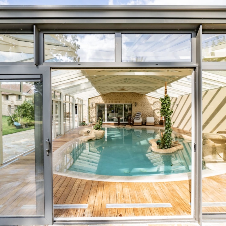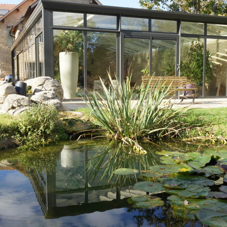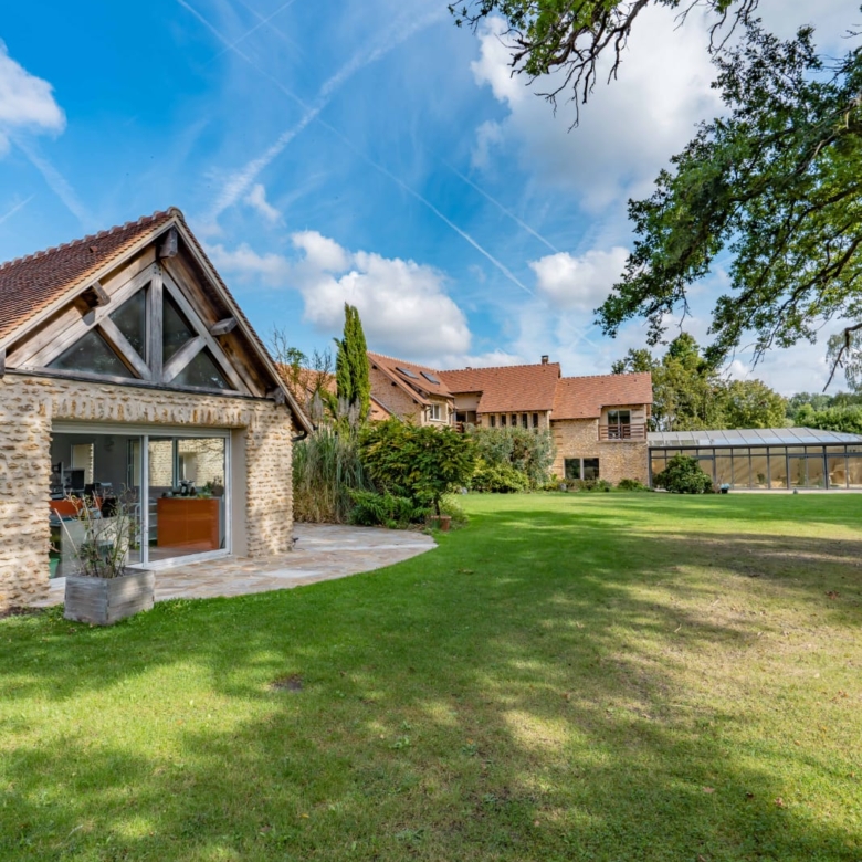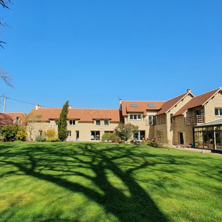 The main house at 5 rue de la Noue is a blend of old and new, featuring a rehabilitated old farmhouse and newly constructed wings. The central part underwent renovations in 2011, including exterior wall insulation and a roof replacement with new insulation. The wings, built in 2010, feature Siporex walls and comprehensive insulation.