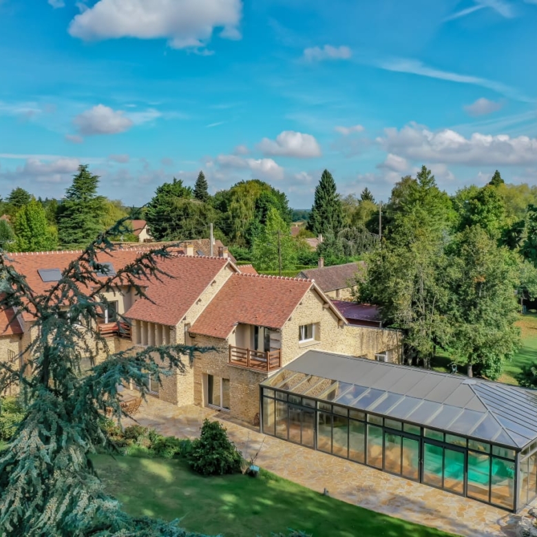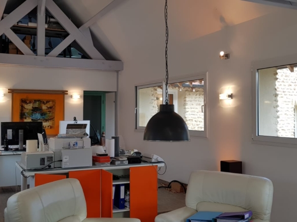 The estate includes several annexes and outbuildings that enhance its functionality and appeal. The left wing annex features a garage with two car spaces and access to a third parking space, a 70-square-meter DIY workshop connected to the garage, an 80-square-meter workshop with large bay windows and garden access, and a cellar.