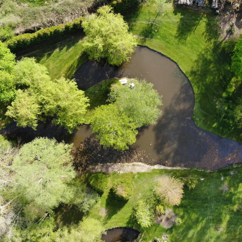 The outdoor areas include a 25-square-meter wooden chalet (with potential for water and electricity connections), a wrought iron greenhouse, two outbuildings for agricultural machinery storage, a large pyre, and a chicken coop on one of the islands.