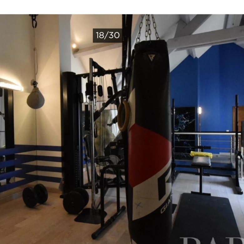 The first floor of the central part, accessible via a staircase in the cathedral dining room, features a mezzanine landing (reading room), two bedrooms, a library, a bathroom, a separate toilet, and a large walk-in closet. The left wing floor offers a fitness room, a cinema room and office, a master bedroom with a private bathroom, dressing room, and terrace, a second large dressing room, two bedrooms with mezzanines and access to a shared terrace, a large bathroom with shower, a third double dressing room, and a separate toilet.