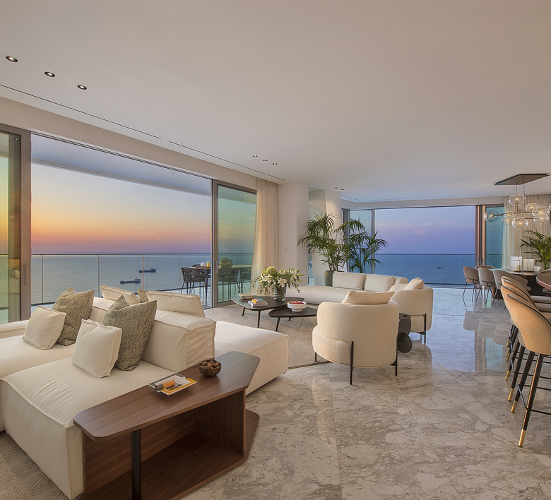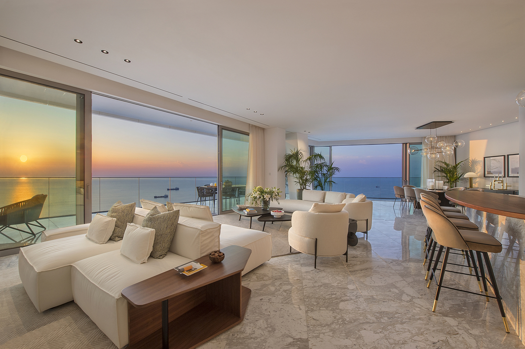 A beautifully proportioned 3-bedroom residence that captures sweeping sea and city views through full-height glass walls. Its elevated position offers privacy, elegance, and a sense of serenity above Limassol’s vibrant coastline. Designed for sophisticated living, this apartment merges contemporary design with timeless coastal appeal.