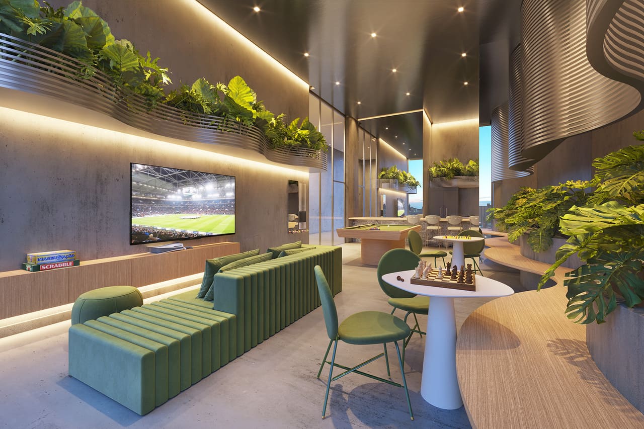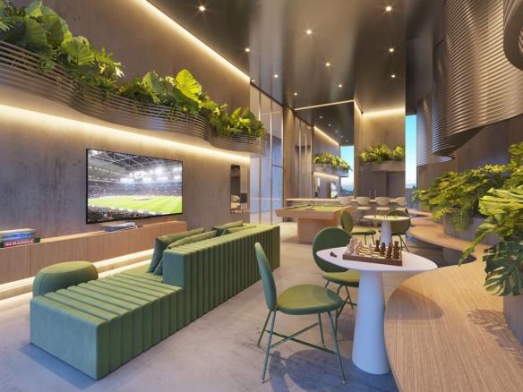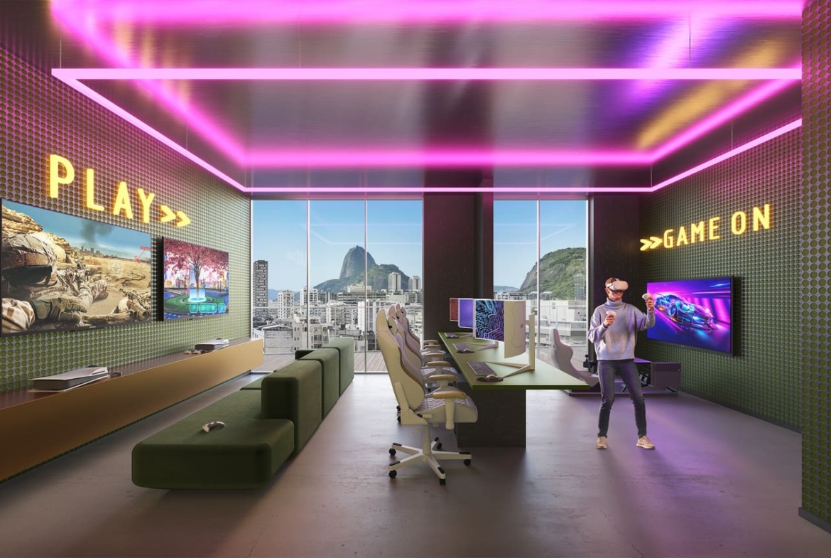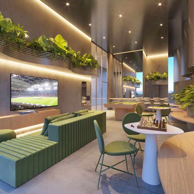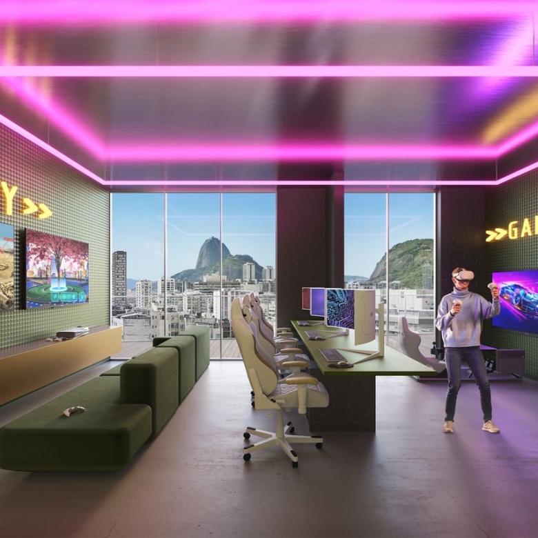 In the 7th floor there will be more 600 square meter for common use. It will include a co-working area, with podcast room, meeting room, and balcony for receiving customers or clients, a pet care room, a lounge for games, a computer gamer lounge, a laundry, a minimarket, a party/gourmet loudge, and a kid’s room.