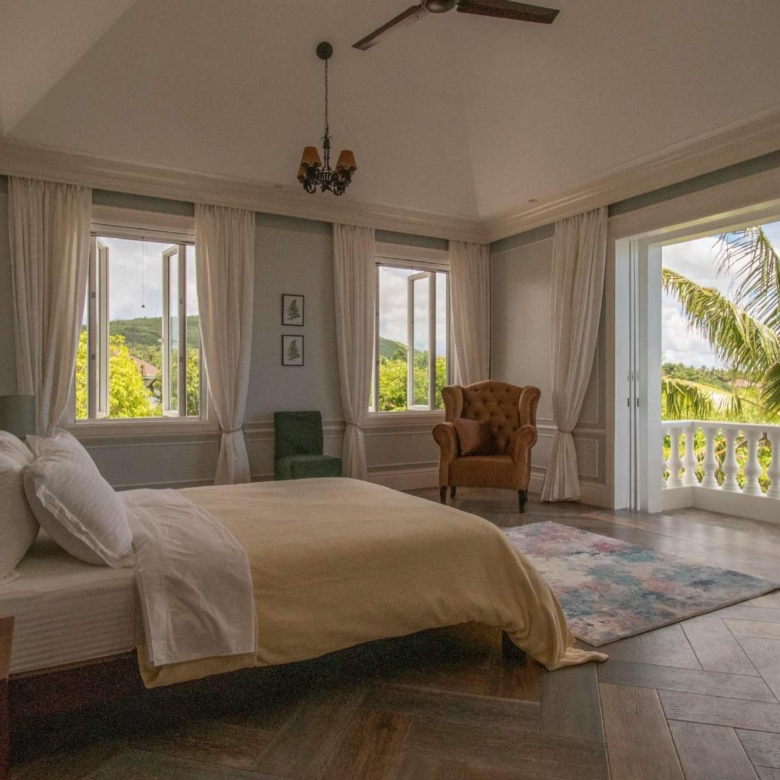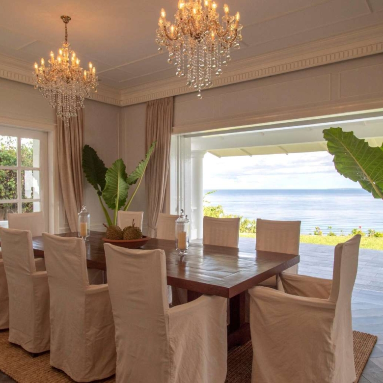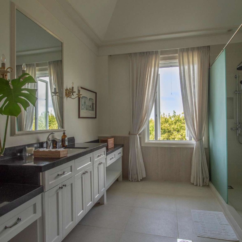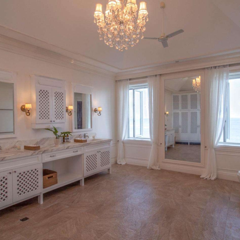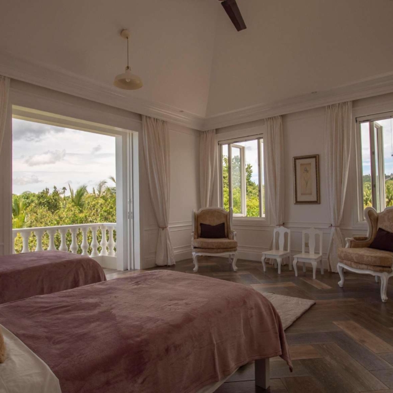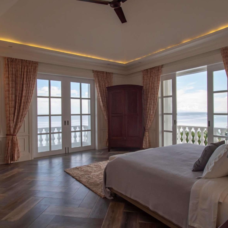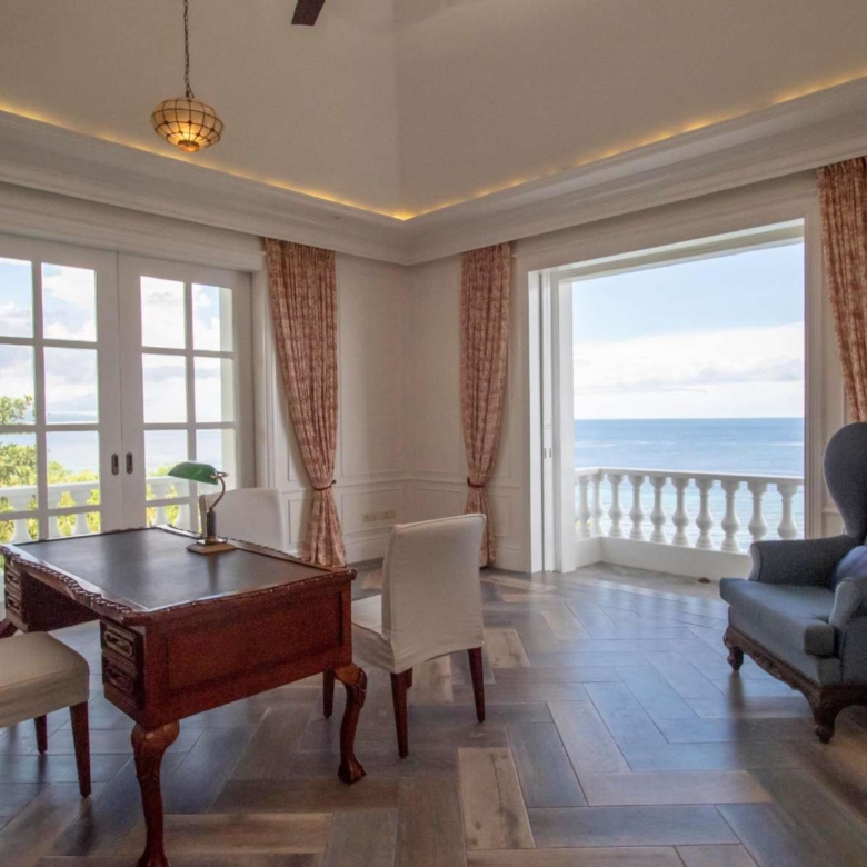 The Manor House, the centerpiece of this remarkable estate, offers a sprawling living space of 550 square meters (5,920 square feet) thoughtfully arranged over two elegant stories. The architectural design prioritizes natural cooling and a sense of spaciousness, featuring soaring 3.7-meter (12-foot) high ceilings on the ground floor and even more impressive 5.2-meter (17-foot) vaulted ceilings on the first floor. The strategic placement of double aspect rooms ensures excellent cross-ventilation and abundant natural light throughout the residence. Every room within the Manor House is adorned with luxurious finishes, including custom-laid flooring that exudes sophistication, bespoke crown molding that adds a touch of timeless elegance, and refined wall paneling that enhances the overall aesthetic. Antique hardwood triple pocket sliding doors seamlessly connect the interior spaces to the numerous balconies and terraces, each featuring elegant French doors with bevelled glass, practical French panels with integrated insect screens, and solid wood shutters, allowing residents to fully embrace the indoor-outdoor lifestyle. The formal Dining Room is graced by a matching pair of heirloom chandeliers, adding a touch of grandeur to every meal. The Drawing Room serves as the ultimate exclusive entertaining space, where residents and their guests can relax and admire the breathtaking panoramic sea views through expansive 4-meter (13-foot) wide sliding doors. A solid hardwood double door entry opens into a grand 10-meter (33-foot) high lobby, anchored by a large antique chandelier and featuring custom windows by the renowned Kenneth & Mock, creating a truly impressive sense of arrival. For modern convenience, the Manor’s main rooms, including the gourmet kitchen, are all Ethernet-connected and equipped with powerful split-type air-conditioning units (3-horsepower per room) to ensure optimal comfort in the tropical climate.