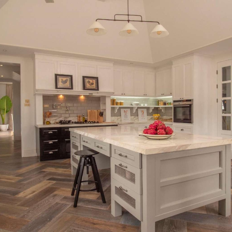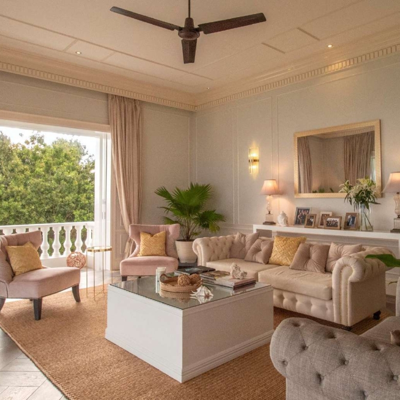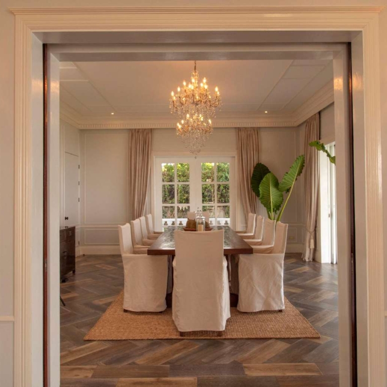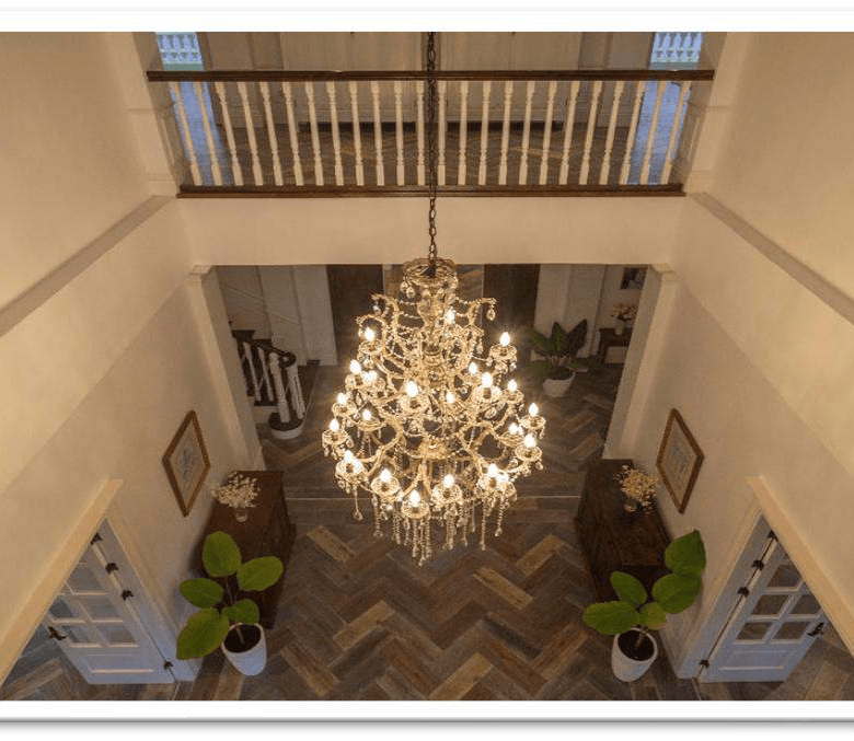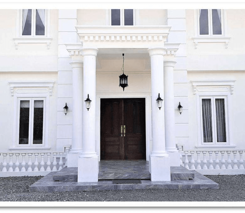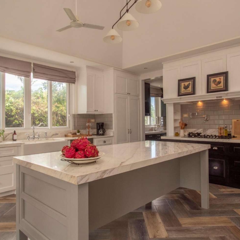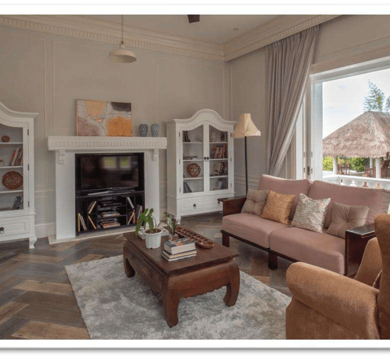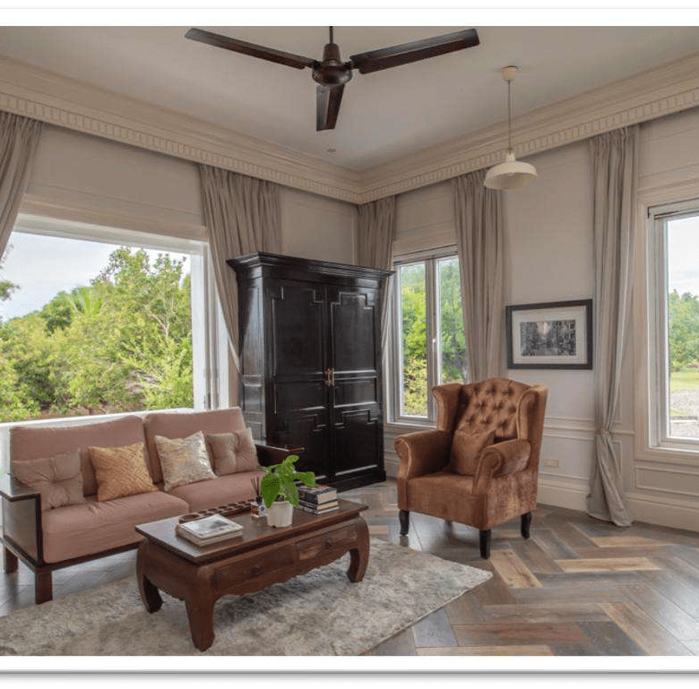 The Manor House, the centerpiece of this remarkable estate, offers a sprawling living space of 550 square meters (5,920 square feet) thoughtfully arranged over two elegant stories. The architectural design prioritizes natural cooling and a sense of spaciousness, featuring soaring 3.7-meter (12-foot) high ceilings on the ground floor and even more impressive 5.2-meter (17-foot) vaulted ceilings on the first floor. The strategic placement of double aspect rooms ensures excellent cross-ventilation and abundant natural light throughout the residence. Every room within the Manor House is adorned with luxurious finishes, including custom-laid flooring that exudes sophistication, bespoke crown molding that adds a touch of timeless elegance, and refined wall paneling that enhances the overall aesthetic. Antique hardwood triple pocket sliding doors seamlessly connect the interior spaces to the numerous balconies and terraces, each featuring elegant French doors with bevelled glass, practical French panels with integrated insect screens, and solid wood shutters, allowing residents to fully embrace the indoor-outdoor lifestyle. The formal Dining Room is graced by a matching pair of heirloom chandeliers, adding a touch of grandeur to every meal. The Drawing Room serves as the ultimate exclusive entertaining space, where residents and their guests can relax and admire the breathtaking panoramic sea views through expansive 4-meter (13-foot) wide sliding doors. A solid hardwood double door entry opens into a grand 10-meter (33-foot) high lobby, anchored by a large antique chandelier and featuring custom windows by the renowned Kenneth & Mock, creating a truly impressive sense of arrival. For modern convenience, the Manor’s main rooms, including the gourmet kitchen, are all Ethernet-connected and equipped with powerful split-type air-conditioning units (3-horsepower per room) to ensure optimal comfort in the tropical climate.