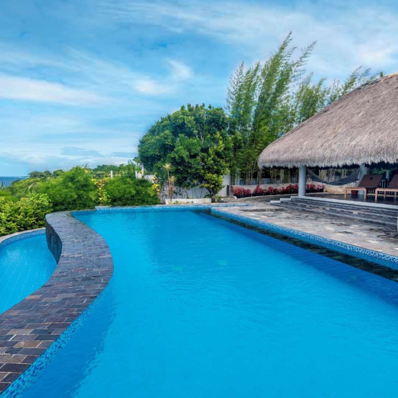 The outdoor amenities at Manor by the Sea are equally impressive, designed for relaxation, recreation, and enjoyment of the stunning surroundings. The expansive infinity pool, measuring 73 square meters (785 square feet), appears to seamlessly merge with the azure waters of the sea, creating a breathtaking visual effect. The pool is surrounded by 76 square meters (818 square feet) of elegant natural Araal stone flooring, providing ample space for lounging and sunbathing. A separate Children’s Pool, measuring 23 square meters (247 square feet), ensures water fun for residents of all ages. A charming 24 square meter (258 square feet) Pool Pavilion, thatched with local cogon grass, offers a shaded retreat throughout the day, perfect for relaxing by the water. A unique natural phenomenon graces the property each year: as the Habagat (southwest monsoon) season transitions to the Amihan (northeast monsoon) season, fresh white sand is naturally deposited onto the estate’s very own private white sand beach, creating a pristine and exclusive shoreline. Manor by the Sea benefits from direct private access to this beach and the inviting sea, offering an unparalleled coastal living experience. The entire estate is fully fenced, ensuring privacy and security, and features magnificent mature landscaped gardens, showcasing a vibrant array of indigenous tropical plants and fruit-bearing trees, creating a lush and fragrant oasis. A separate Coach House provides ideal accommodation for visiting family and/or guests. With a total construction area of 198 square meters (2,131 square feet), the Coach House offers ample living space, including three additional well-appointed bedrooms (each with a ceiling fan and air-conditioning), three modern bathrooms, and a comfortable fitted kitchen, lounge, and dining area (also equipped with ceiling fans and air-conditioning). The ground floor of the Coach House also features a convenient 2-car garage, practical utility areas, a dedicated staff office, and a useful store room. This fully independent Coach House serves as a practical and perfect complement to the Manor, providing flexible accommodation and enhancing the overall appeal of the estate.