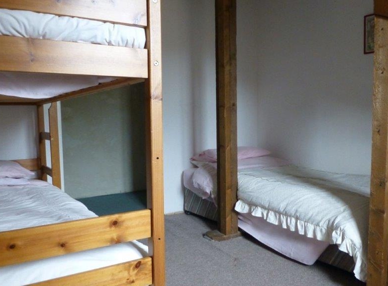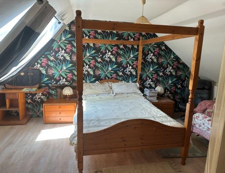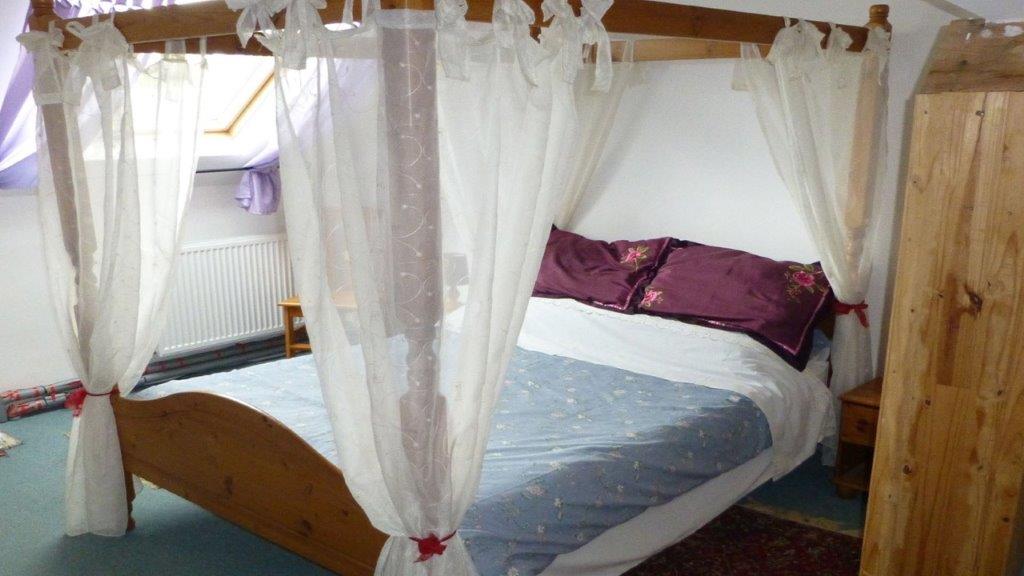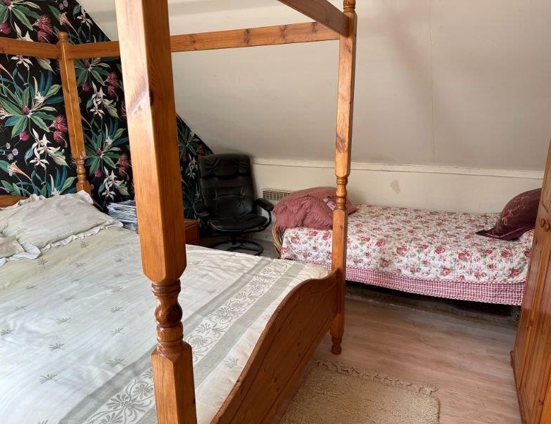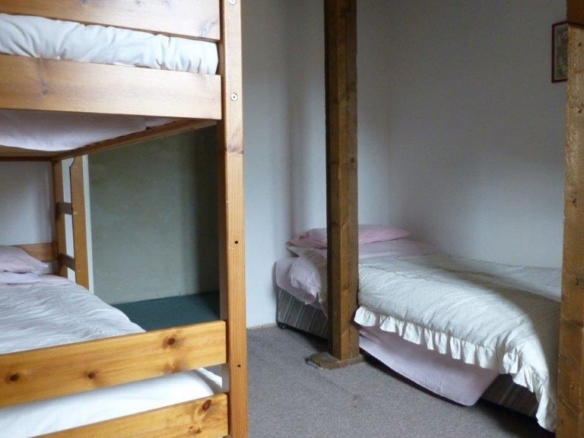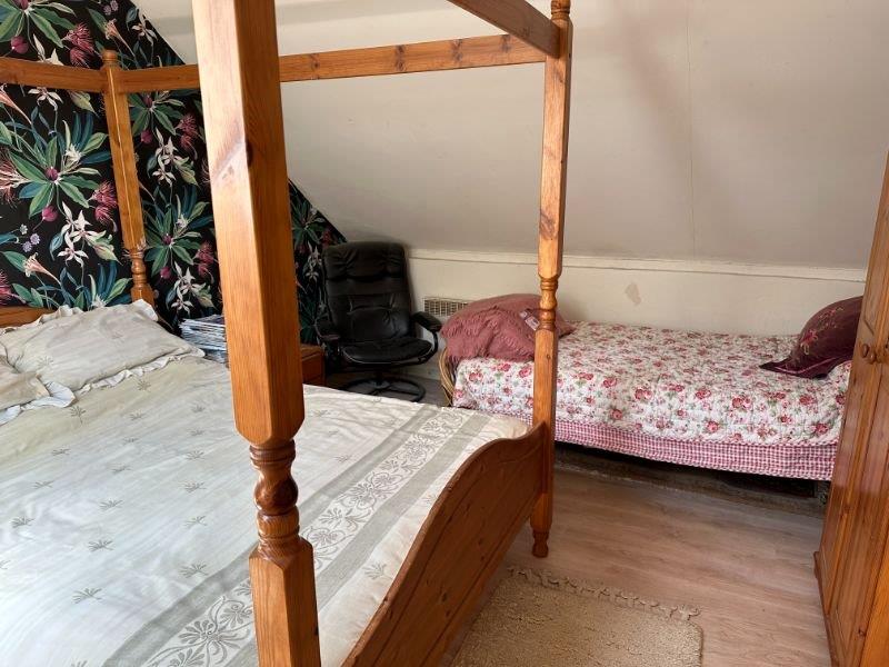 Partly glazed door and window to west elevation. Granite fireplace with wood burner (with back boiler). Bathroom 3.09 x 2.04m Window to rear elevation. Tiled floor. WC. Pedestal basin. Radiator. Open shower with handrail. Bedroom 1 4.58 x 3.42m Window to east and north elevations. Tiled floor. Radiator.